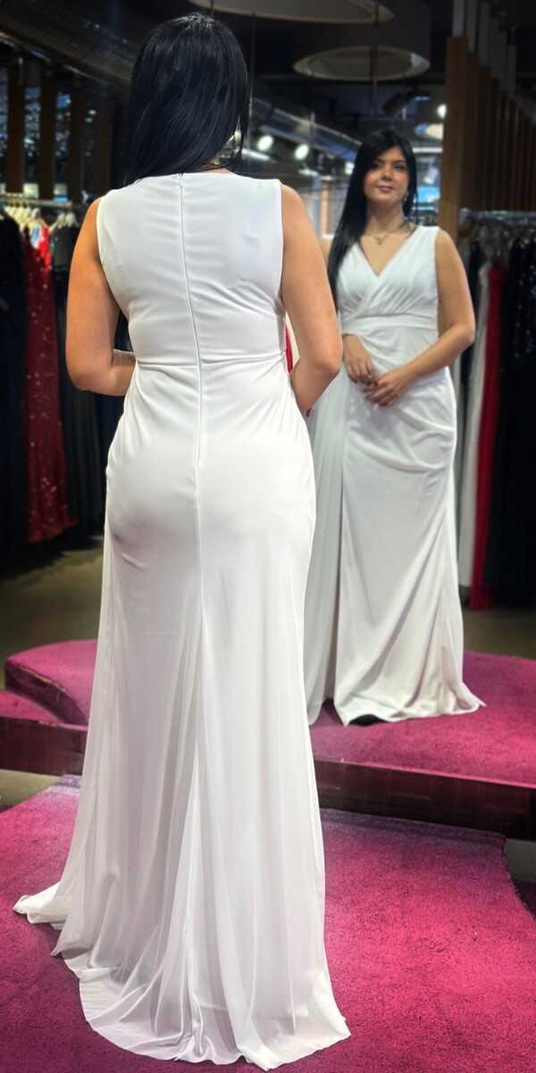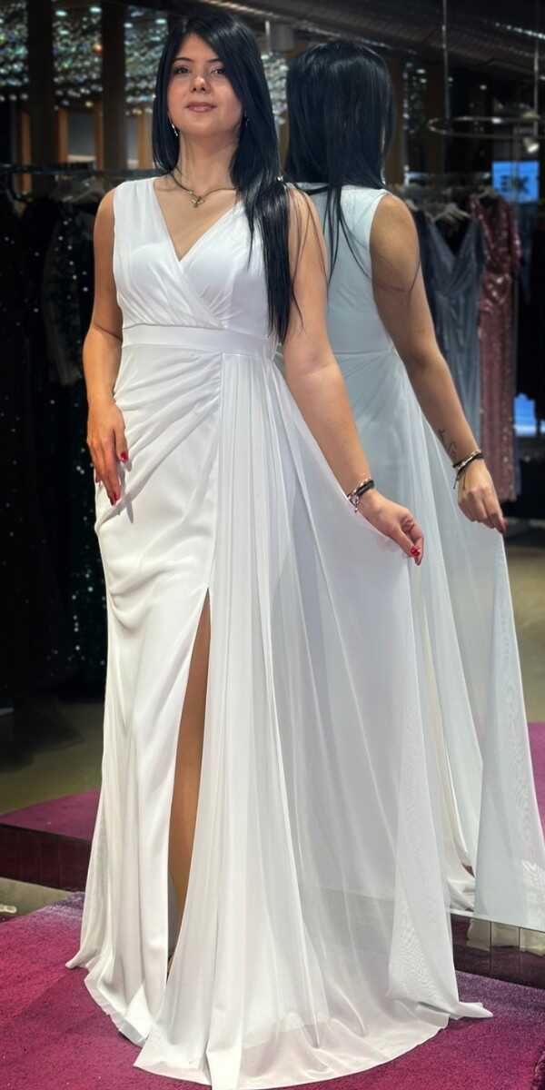 White Color Straight Cut, Long Evening Dress, Has Been Produced From Lycra Fabric. Slit Detail Will Present A Brave And Striking Style. It Will Increase The Quality Of Your Whole Day By Being Very Comfortable, Smooth And Soft Increasing Your The Comfort Level.