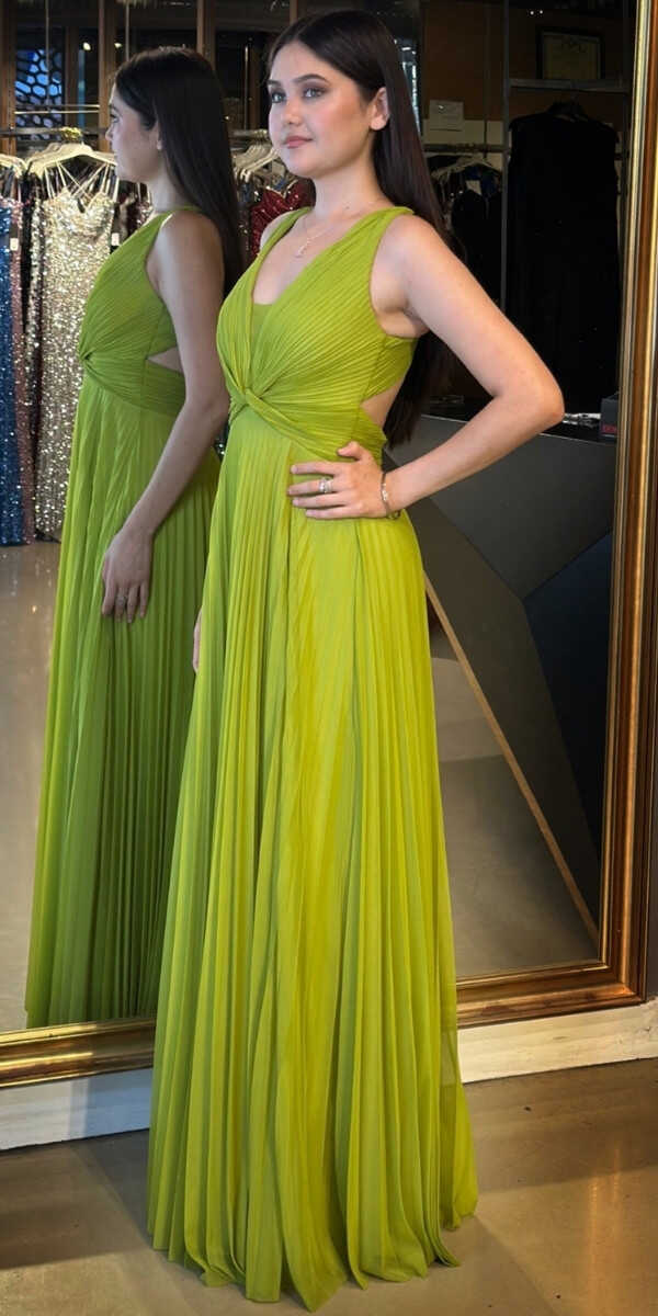 Fıstık Yeşili Renk Kloş Etekli Uzun Abiye Elbise, şifon tül Kumaştan Üretilmiş olup Chiffon Tulle Şık Sırt Dekoltesi Size Çok Yakışacak.