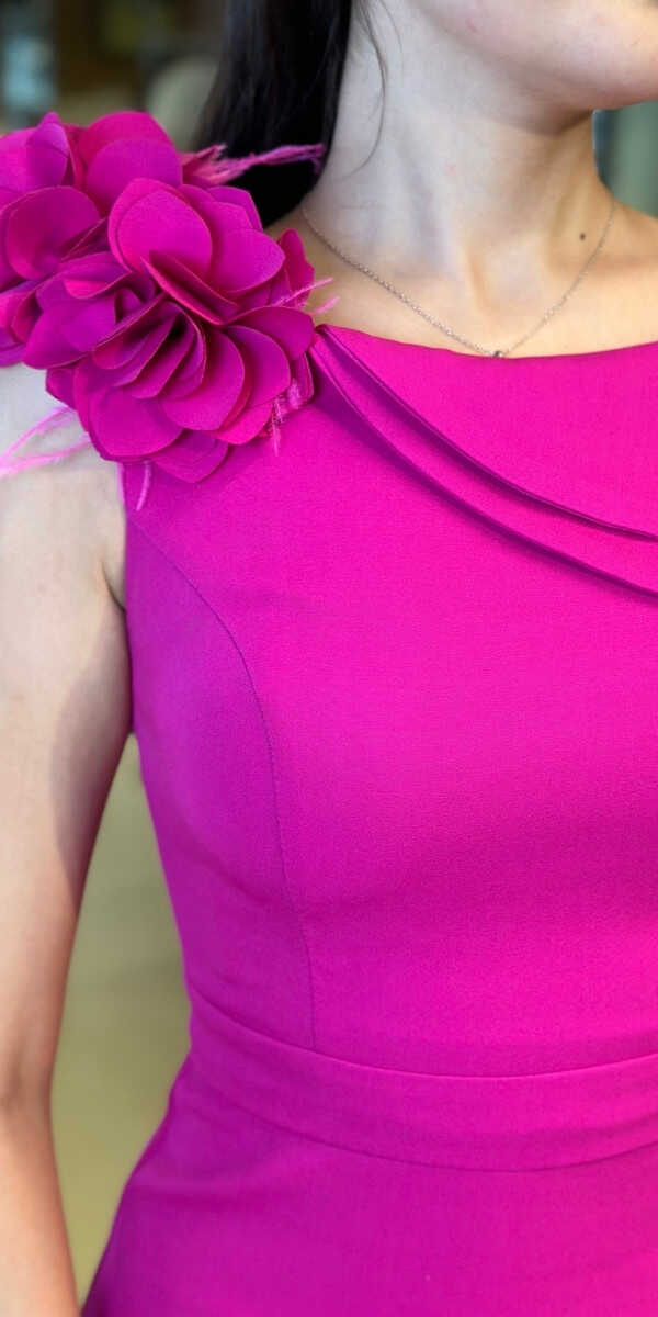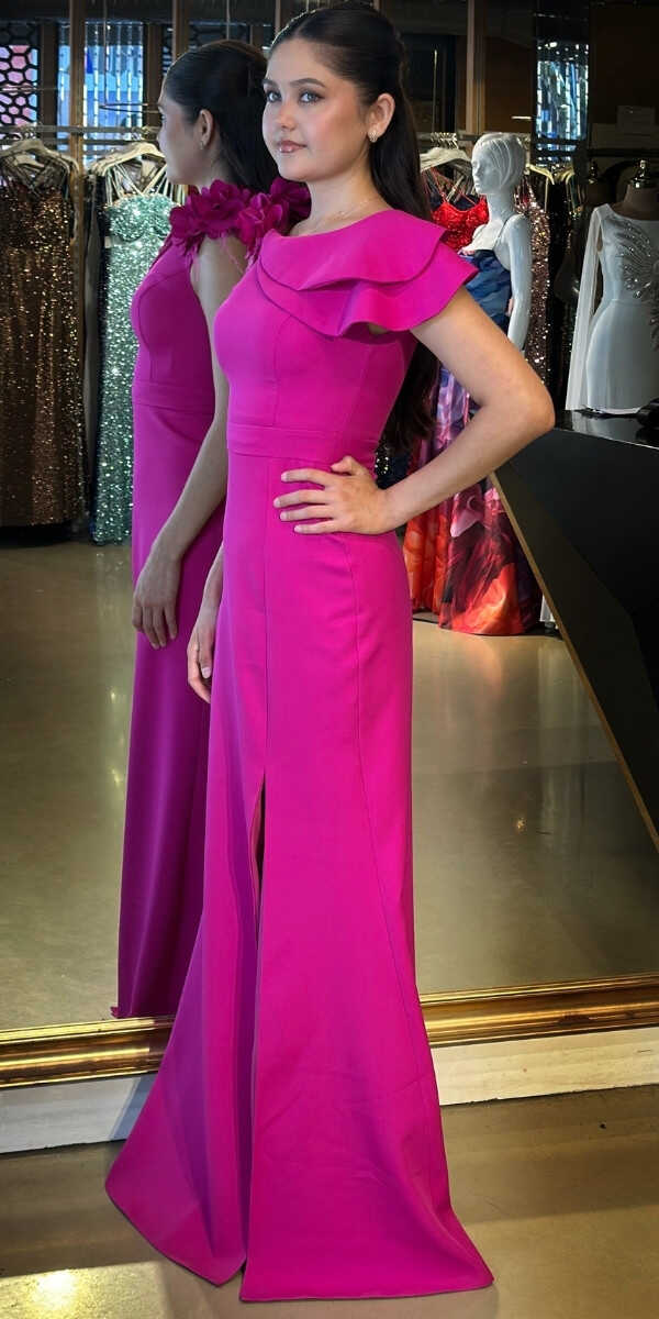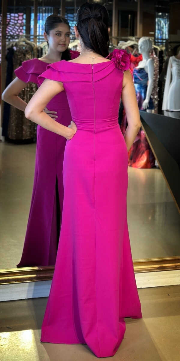 Fuşya Renk Düz Kesim Uzun Abiye Elbise, Krep Kumaştan Üretilmiş olup Hafif Ve Daha Az Kırışan Krep Kumaş Sizi Daha Rahat Hissettirecektir. Çiçek Detayı Modern Bir Görünüm Yaratacaktır.. Yırtmaç Detayı Cesur ve Çarpıcı Bir Stil Sunacaktır.