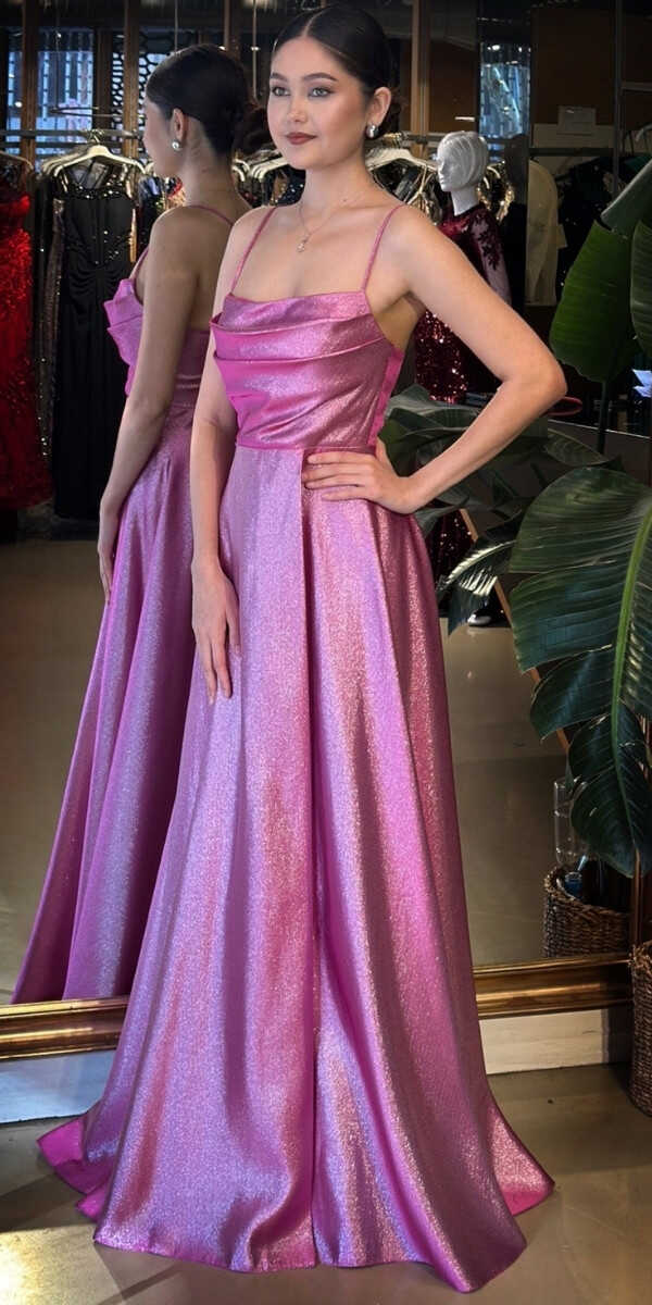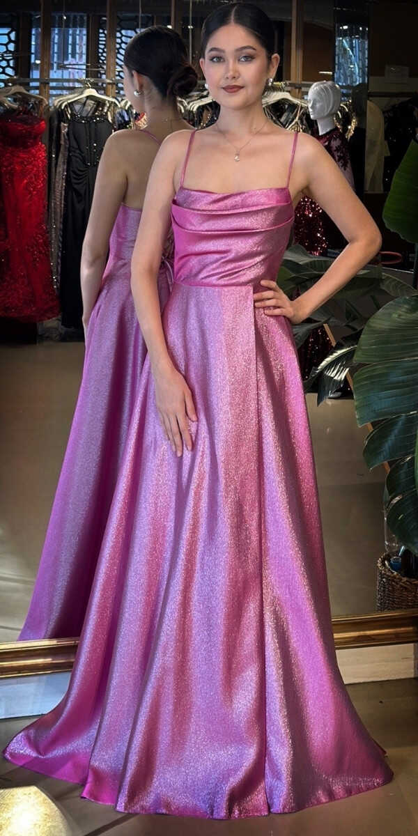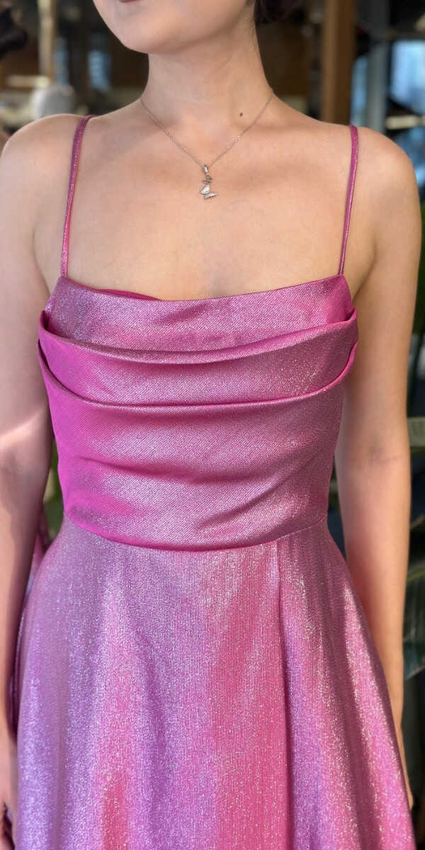 Degaje Yaka Fuşya Renk Kloş Etekli Uzun Abiye Elbise, Saten Kumaştan Üretilmiş olup Satenin Pürüzsüz Işığı Görünümünüze Zarafet Katacaktır. Elbisedeki İp Askılar Kullanım Kolaylığı Yaratacaktır. Şık Sırt Dekoltesi Size Çok Yakışacak.