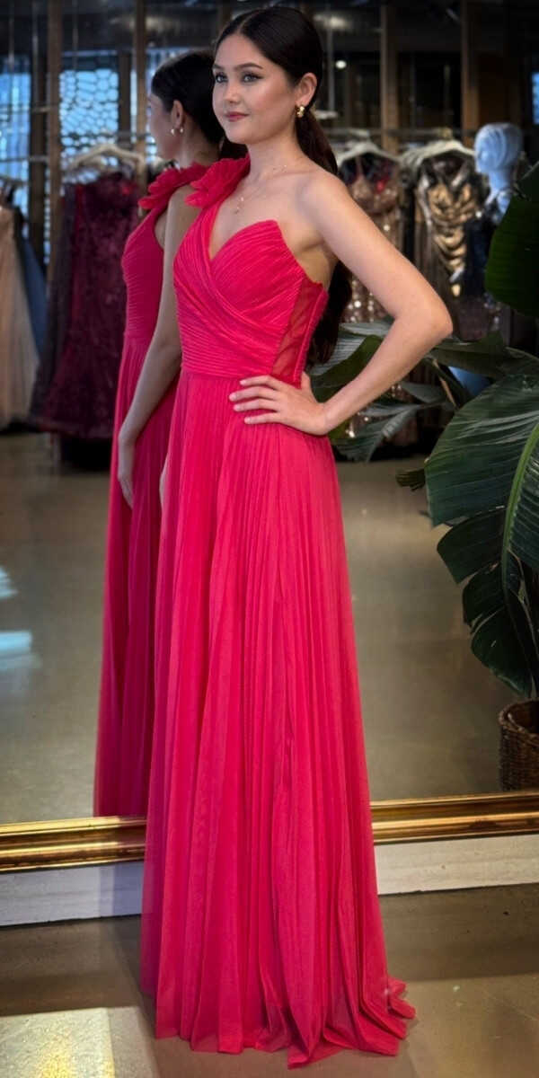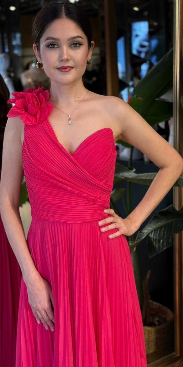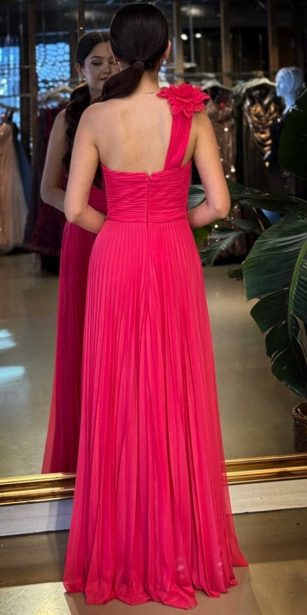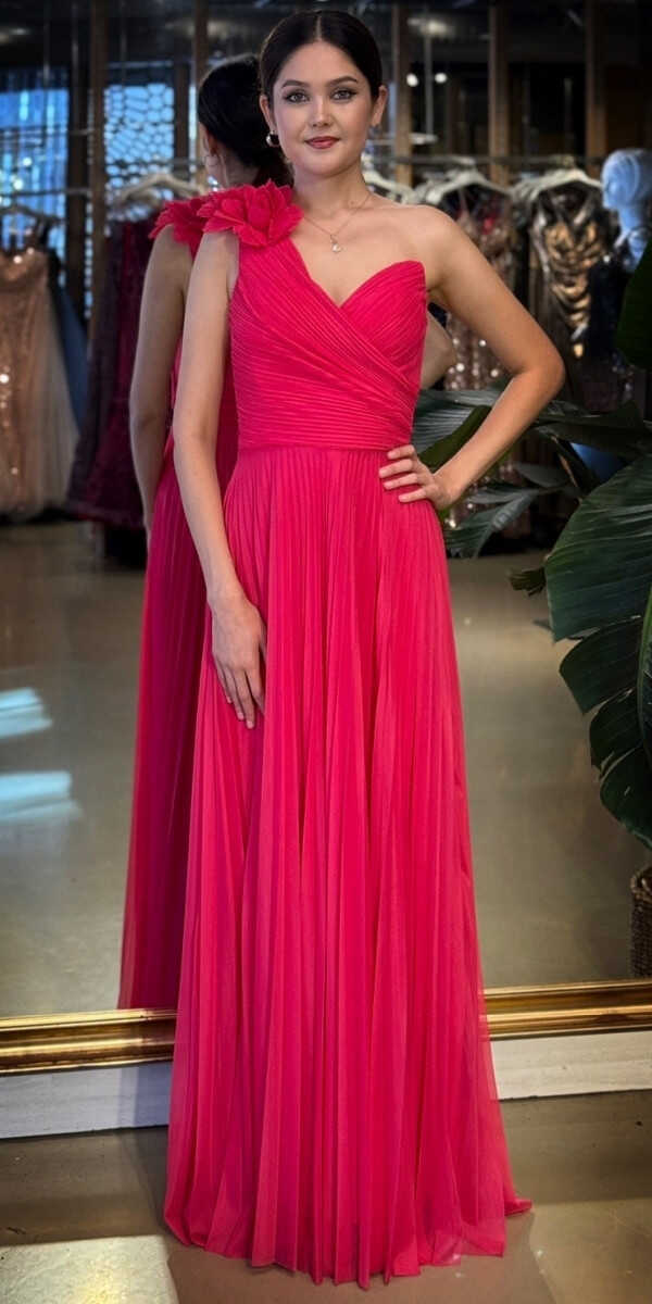 Fuşya Renk Kloş Etekli Uzun Abiye Elbise, Şifon Tül Kumaştan Üretilmiş olup Şifon tül kumaşıyla uçuş uçuş bir görünüm sağlar. Tek omuz detayıyla modern bir ifade oluşturur.