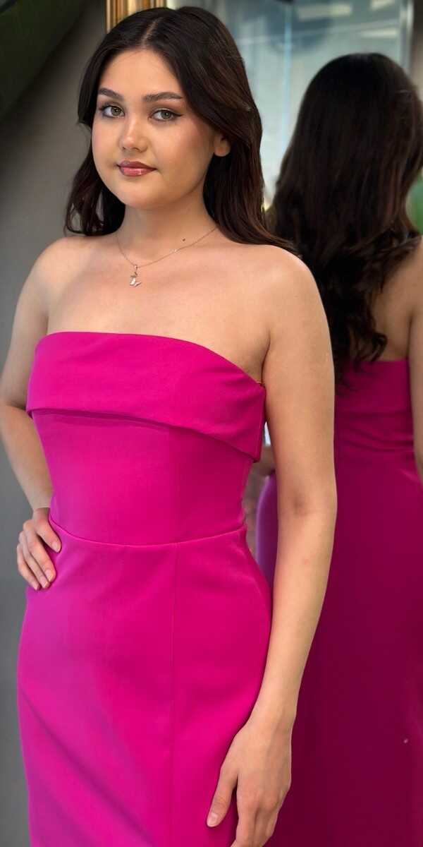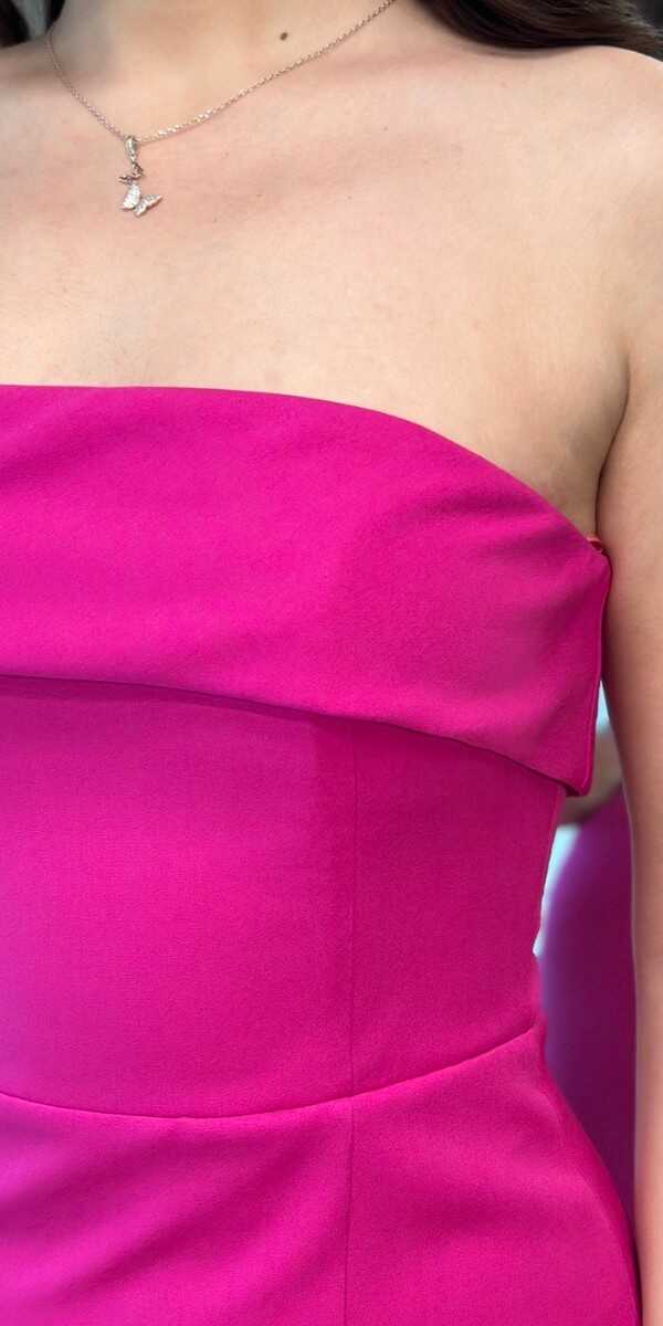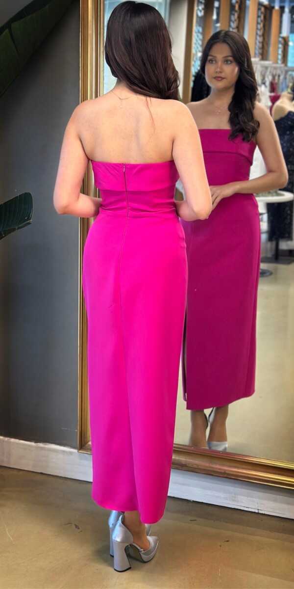 Fuşya Renk Düz Kesim Midi Abiye Elbise, Krep Kumaştan Üretilmiş Olup Hafif Ve Daha Az Kırıştığı İçin Kumaş Sizi Rahat Hissettirecektir. Yırtmaç Detayı Cesur ve Çarpıcı Bir Stil Sunacaktır.
