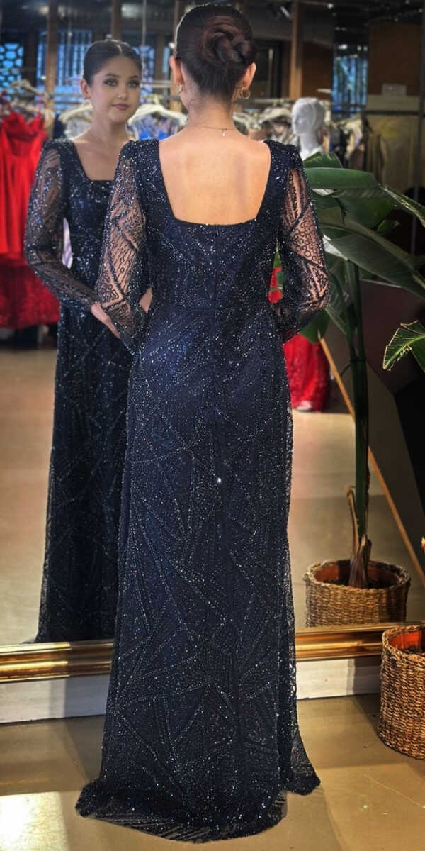 Gelince Haber VerKare Yaka Gece Mavisi Renk Kloş Etekli Uzun Abiye Elbise, Pullu Boncuklu Kumaştan Üretilmiş olup Parıltı ve Zarafetin Buluştuğu Kumaş Türü Sizi Işıl Işıl Gösterecektir. Uzun kollarıyla, kollarınızı zarif bir şekilde kapatır.