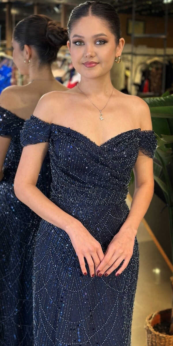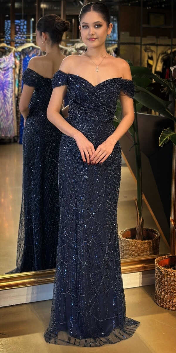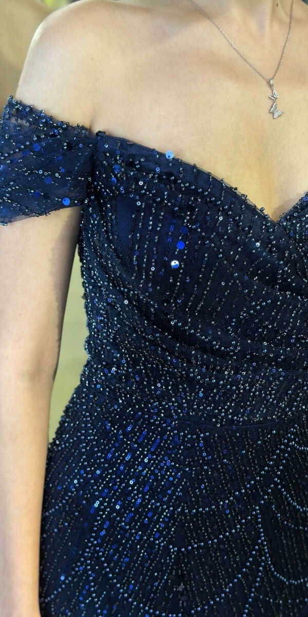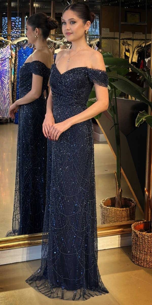 Madonna Yaka Gece Mavisi Renk Düz Kesim Uzun Abiye Elbise, Pullu Boncuklu Kumaştan Üretilmiş olup Parıltı ve Zarafetin Buluştuğu Kumaş Türü Sizi Işıl Işıl Gösterecektir. Şık Sırt Dekoltesi Size Çok Yakışacak.