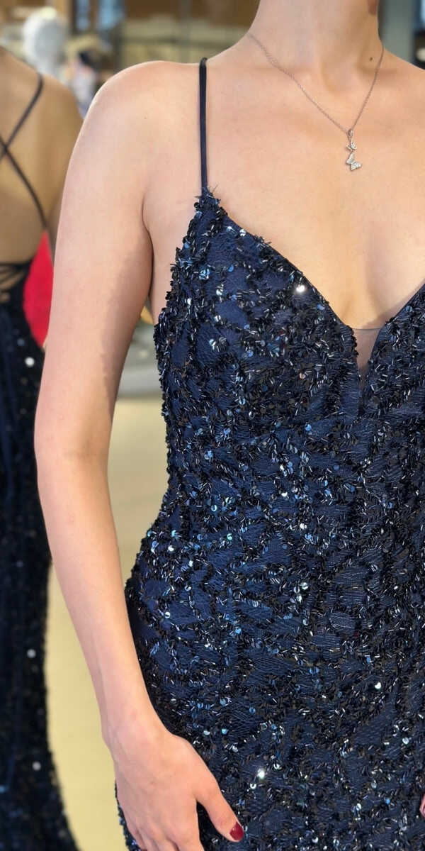 V Yaka Gece Mavisi Renk Balık Etekli Uzun Abiye Elbise, Pul Payet Kumaştan Üretilmiş olup Likralı ve Payet İşlemeli Kumaşı, Dikkat Çekici Işıltısının Yanı Sıra Vücudunuzu Sararak Sizi Olduğunuzdan İnce Gösterecektir. Elbisedeki İp Askılar Kullanım Kolaylığı Yaratacaktır. Şık Sırt Dekoltesi Size Çok Yakışacak.