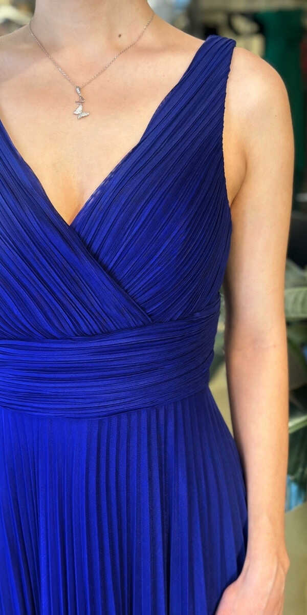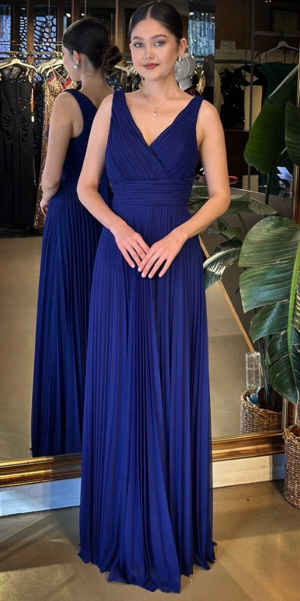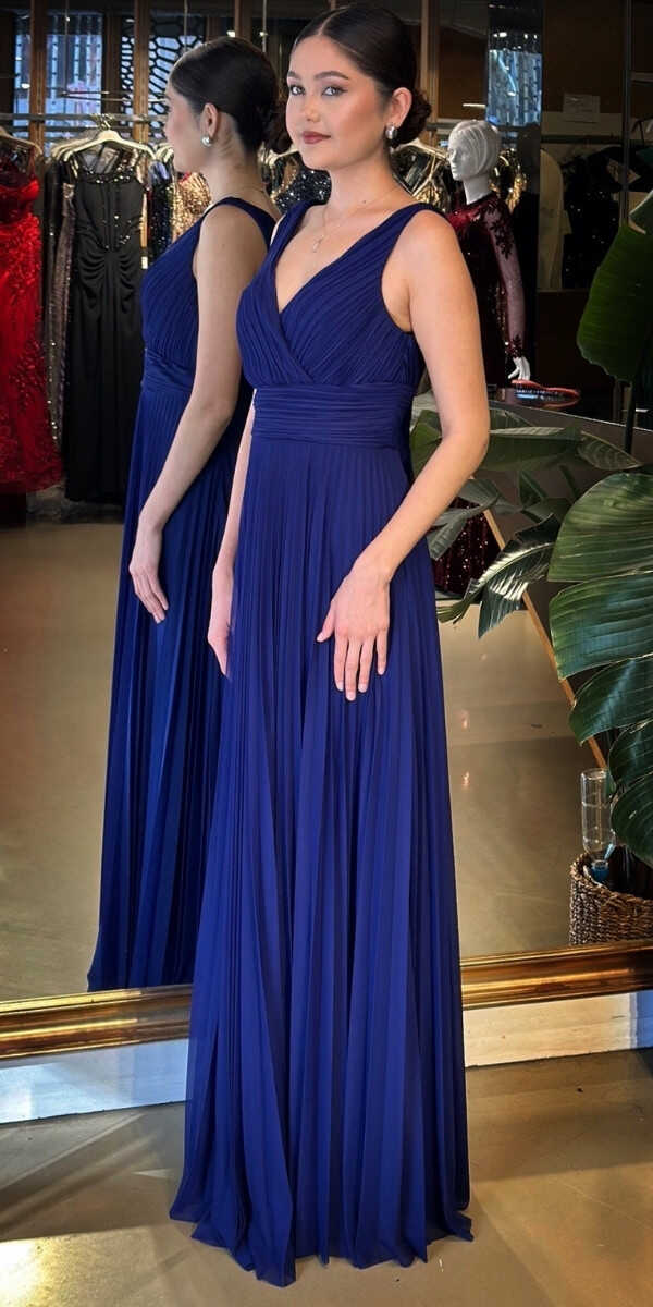 V Yaka Gece Mavisi Renk Kloş Etekli Uzun Abiye Elbise, Şifon Kumaştan Üretilmiş olup Uçuş Uçuş Şifon Kumaş Tüm Dikkatleri Üzerinize Toplayacaktır. Kalın askılı yapısıyla destekleyici ve modern bir görünüm sağlar.