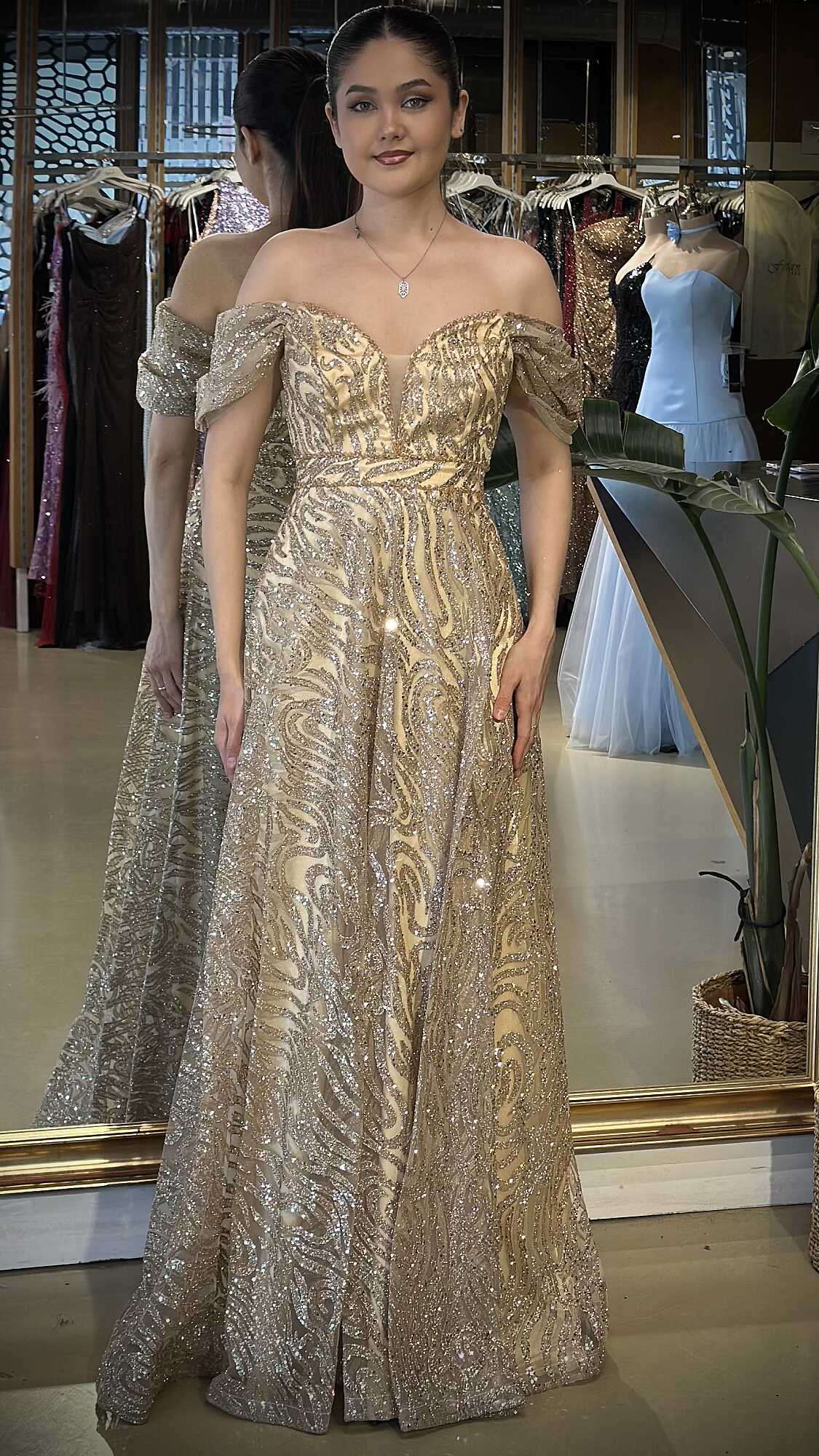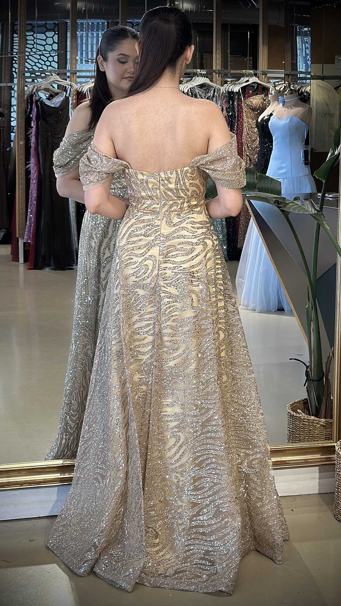 GOLD Renk Kloş Etekli Uzun Abiye Elbise, Simli Kumaştan Üretilmiş olup Simlerin Işıltısıyla Çok Hoş Gözükeceksiniz