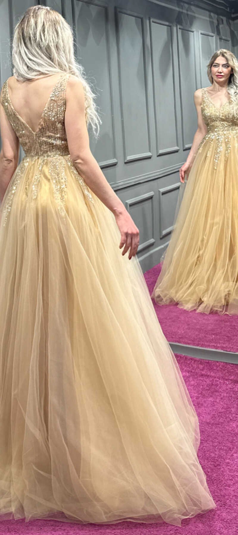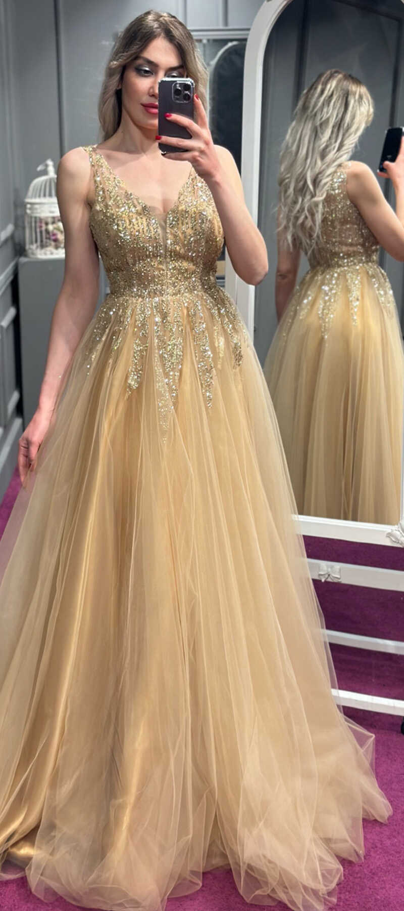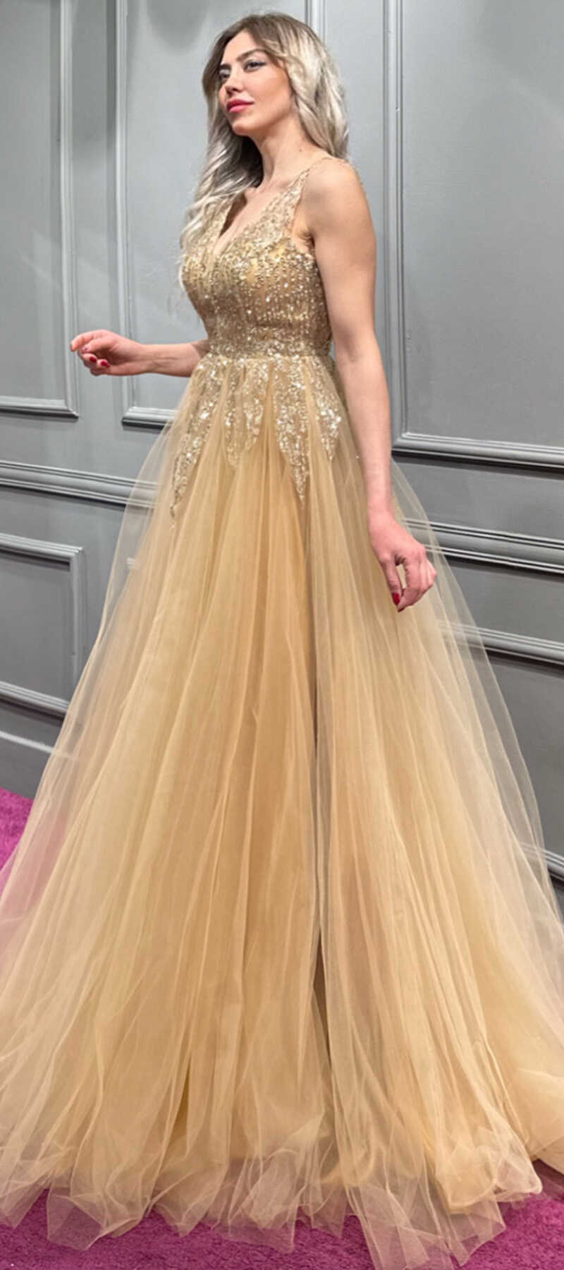 Gold Renk Kloş Etekli Uzun Abiye Elbise, Tül Kumaştan Üretilmiş Olup Hafif Olmasından Kaynaklı Sizi Gece Boyu Rahat Hissettirecek. Renk Kloş Etekli Uzun Abiye Elbise, Tül Kumaştan Üretilmiş Olup Hafif Olmasından Kaynaklı Sizi Gece Boyu Rahat Hissettirecek.