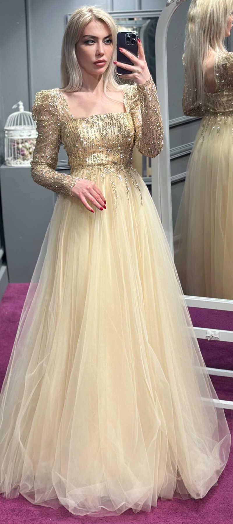 Gold Uzun Kollu Kloş Etekli Tül Uzun Abiye Elbise 7352