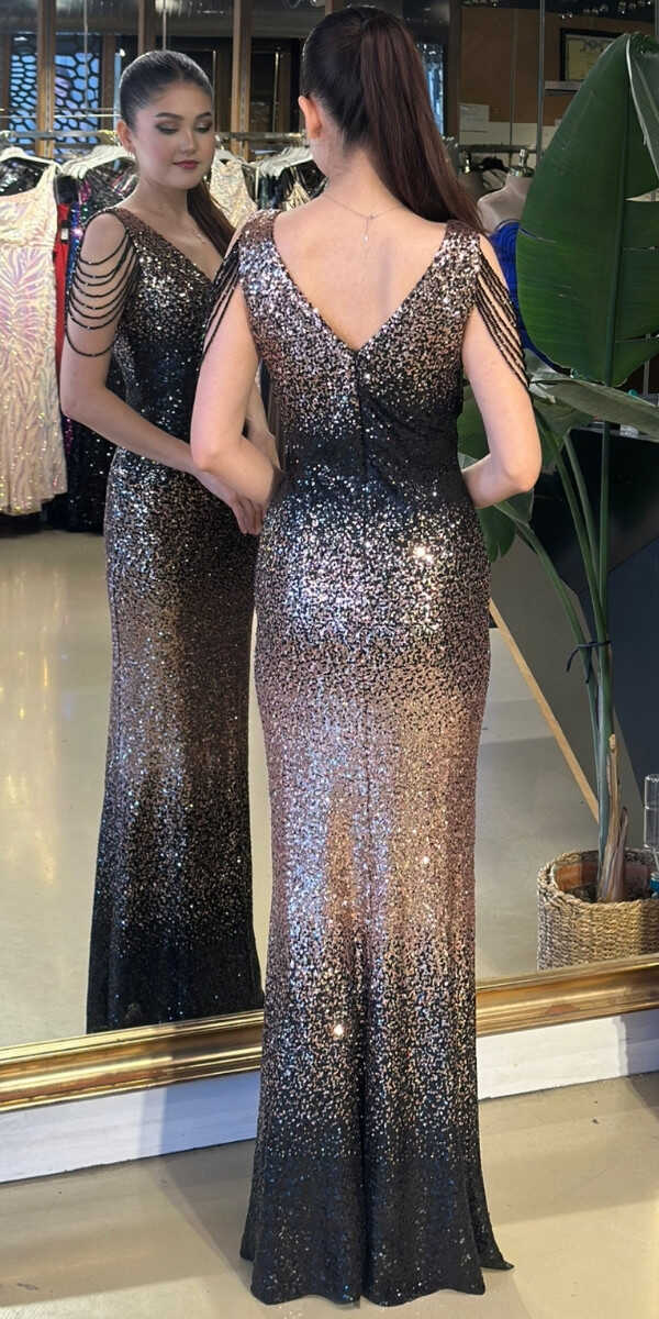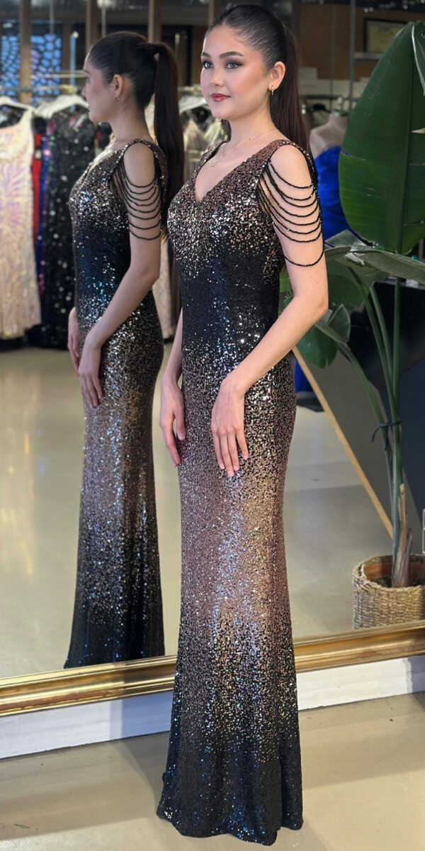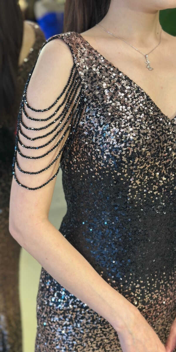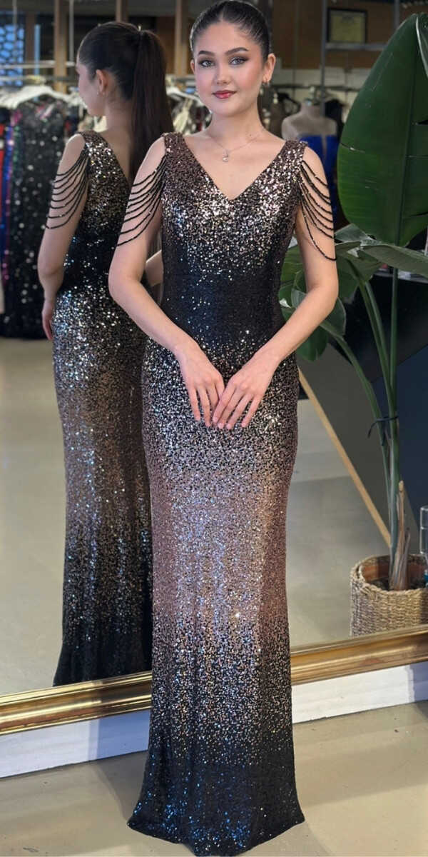 V Yaka Gold Renk Düz Kesim Uzun Abiye Elbise, Payet Kumaştan Üretilmiş olup Pırıltısıyla Göz Kamaştıracaktır. Kalın askılı yapısıyla destekleyici ve modern bir görünüm sağlar. Boncuk süslemeleriyle her adımda ışıldar.