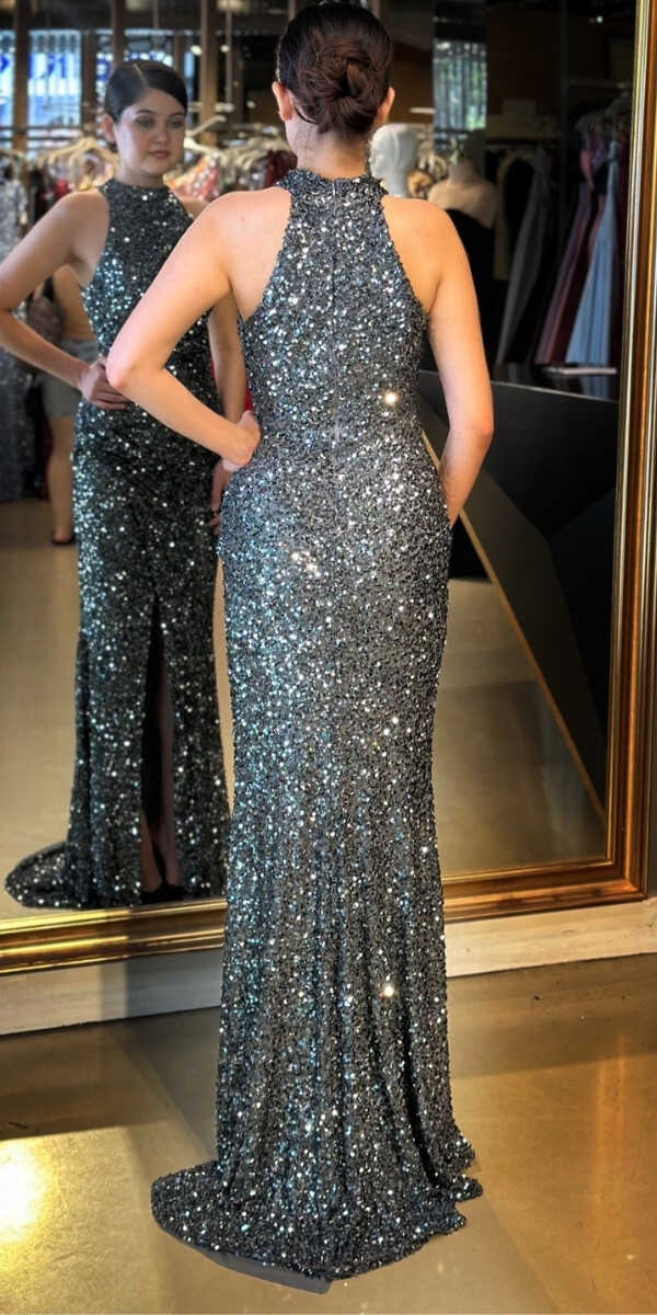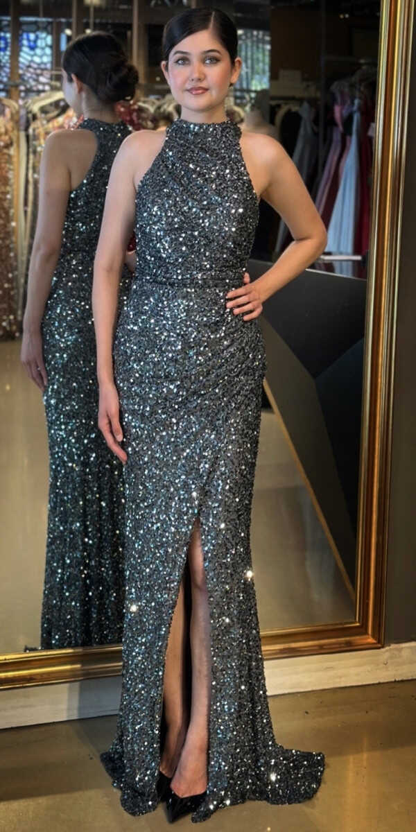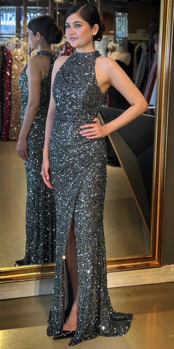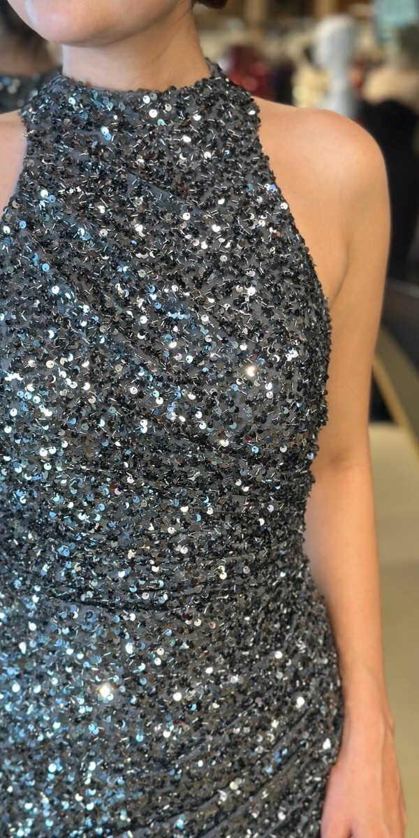 Gri Renk Düz Kesim Uzun Abiye Elbise, Payet Kumaştan Üretilmiş olup Pırıltısıyla Göz Kamaştıracaktır. Yırtmaç Detayı Cesur ve Çarpıcı Bir Stil Sunacaktır.
