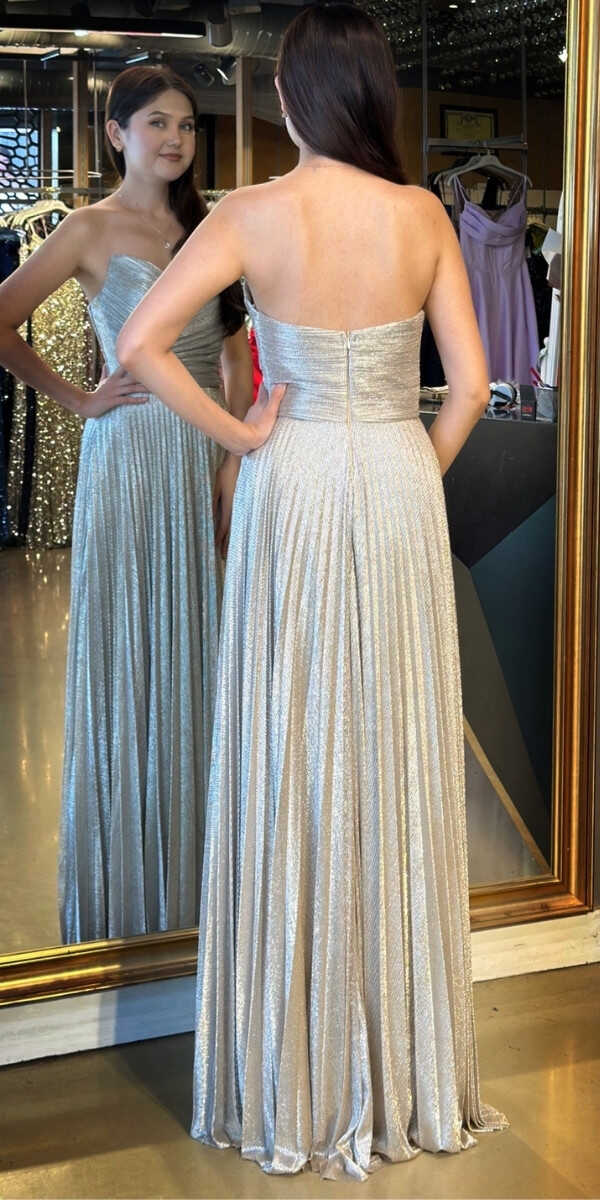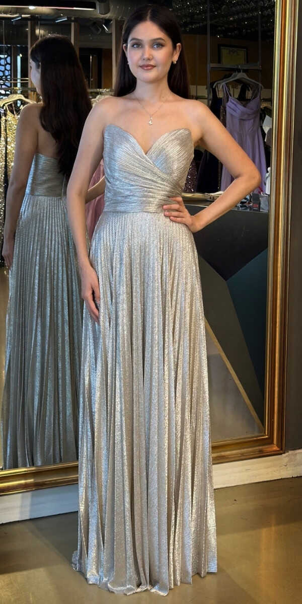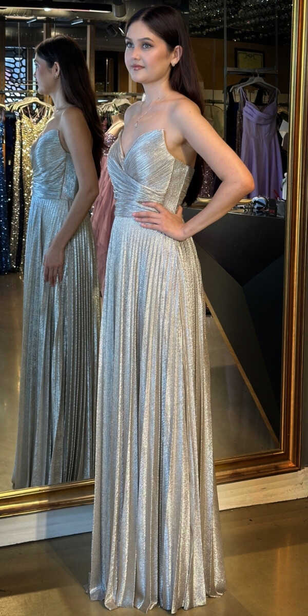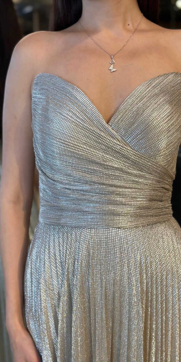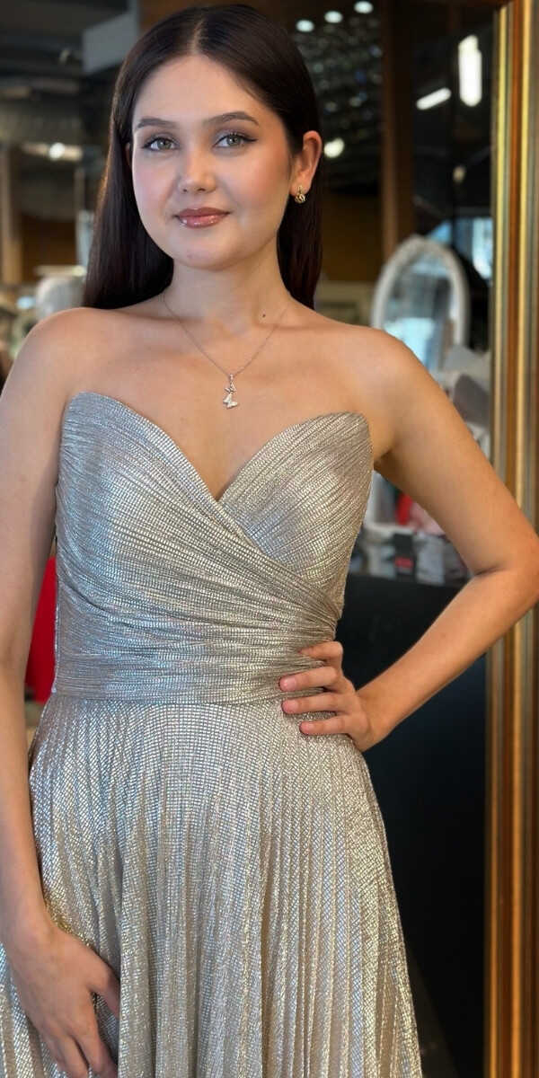 Gri Renk Kloş Etekli Uzun Abiye Elbise, Jakarlı Kumaştan Üretilmiş Olup Sizi Gecenize Işıltı Katacaktır