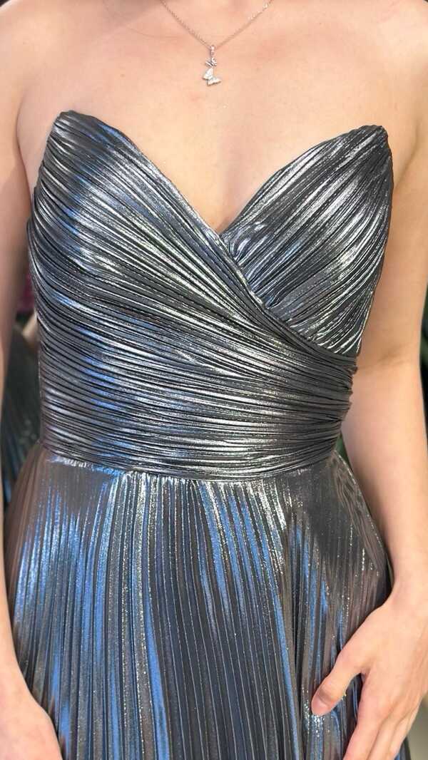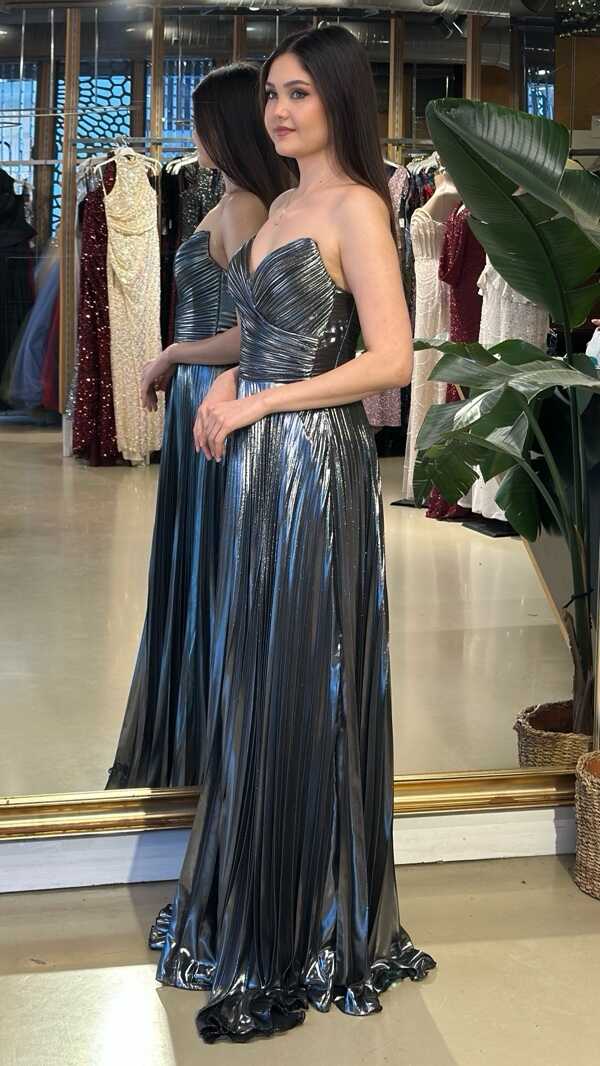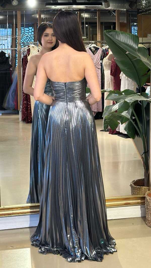 Straplez Yaka Gri Renk Kloş Etekli Uzun Abiye Elbise, Parlak Kumaş Kumaştan Üretilmiş olup Parlak dokusu sayesinde her adımda ışıltınızı yansıtın.