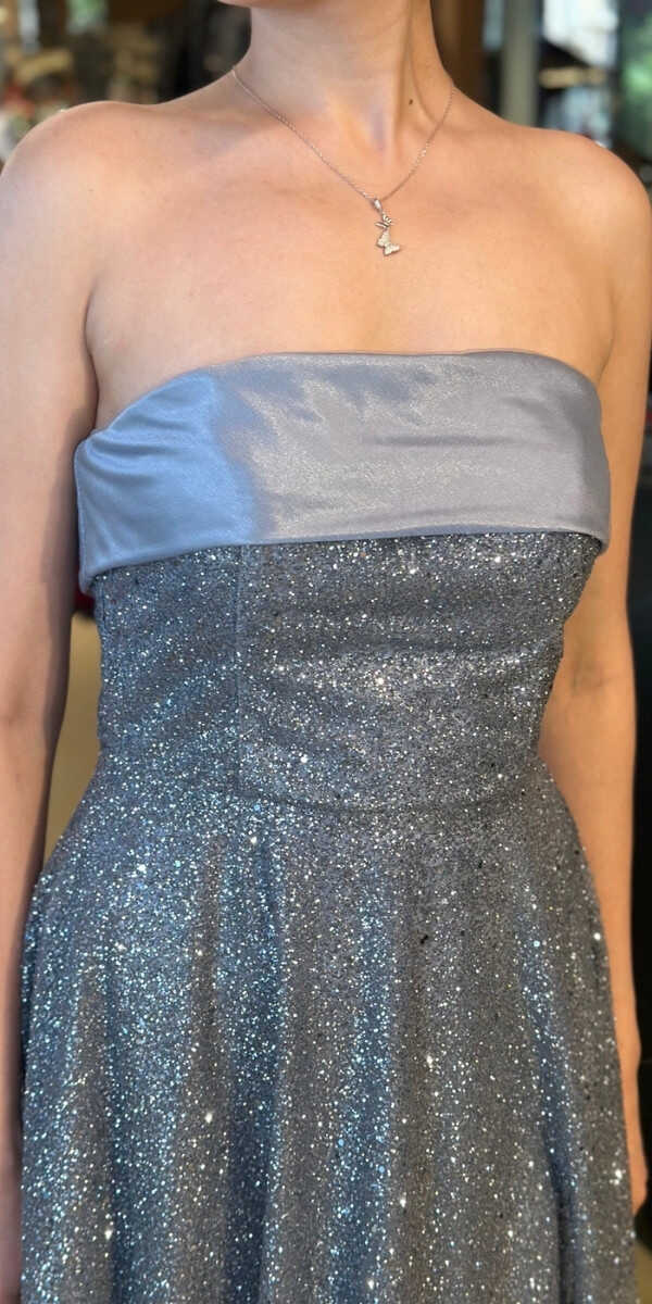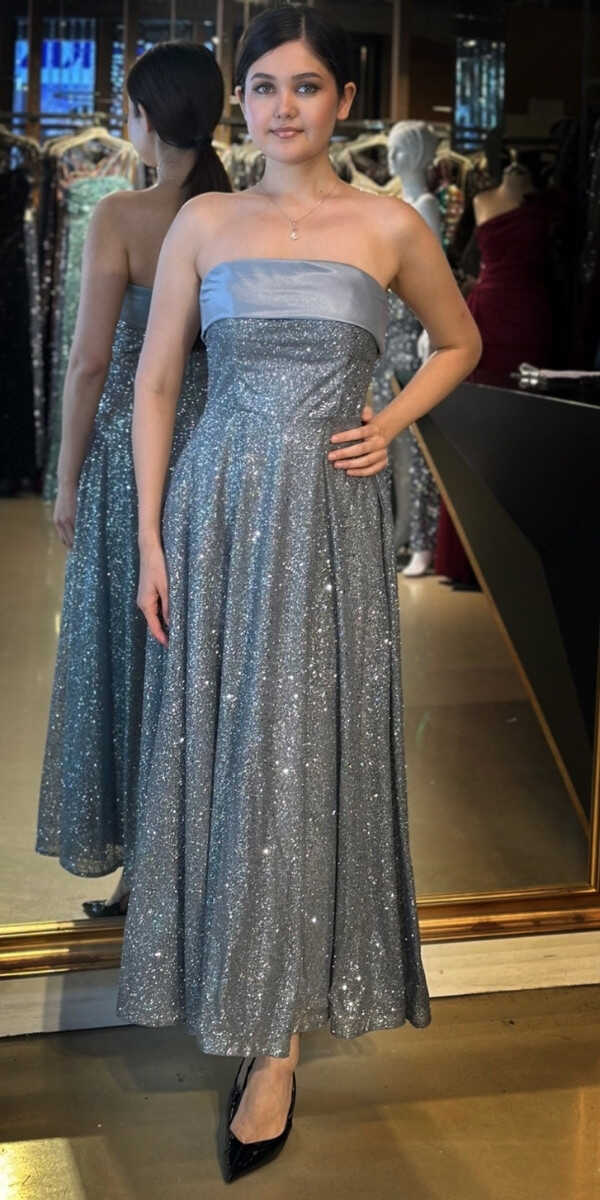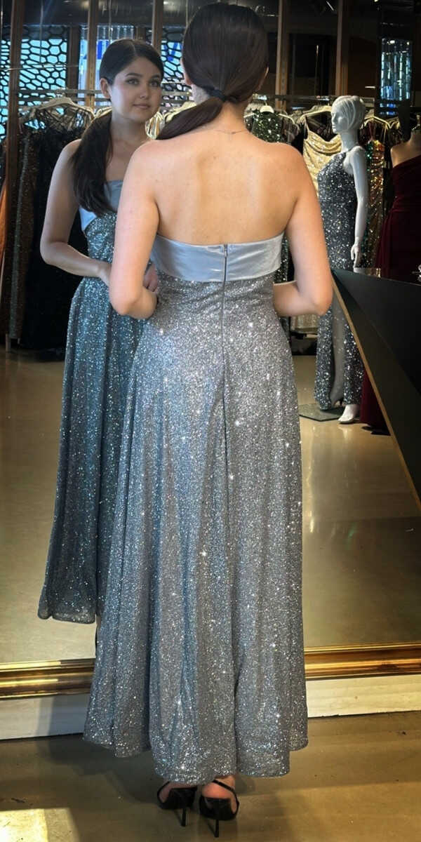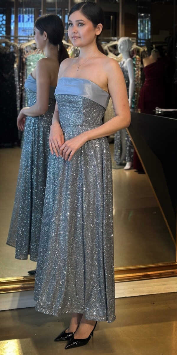 Gri Renk Kloş Etekli Midi Abiye Elbise, Simli Kumaştan Üretilmiş olup Simlerin Işıltısıyla Çok Hoş Gözükeceksiniz