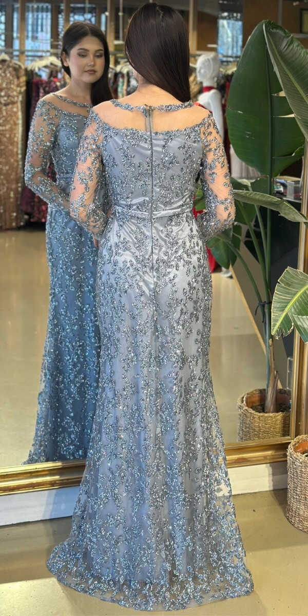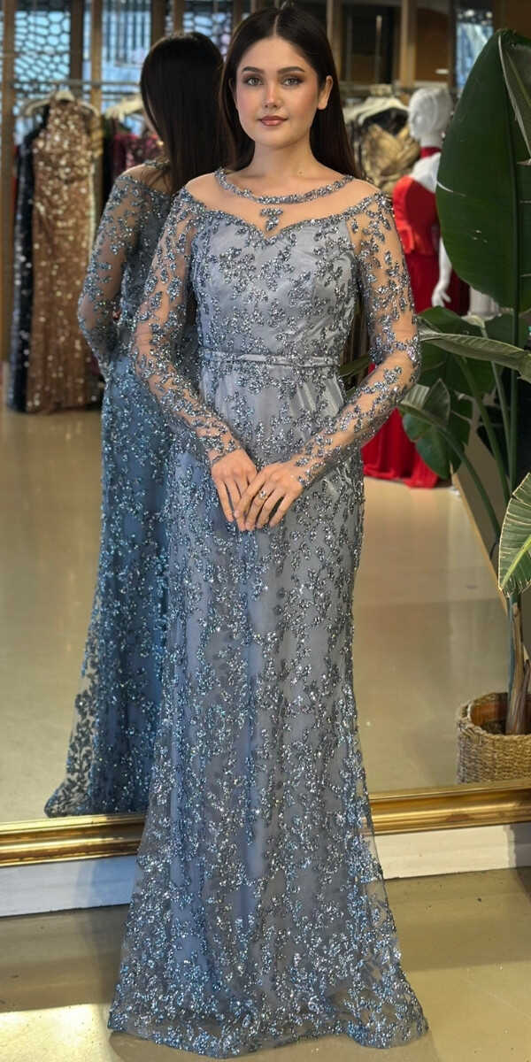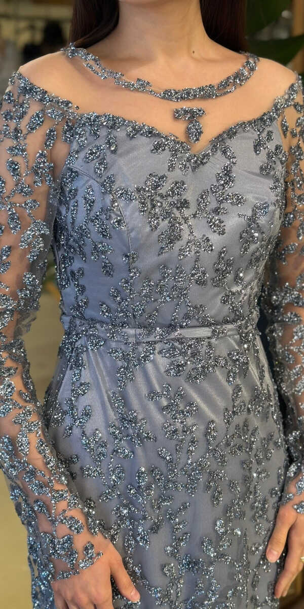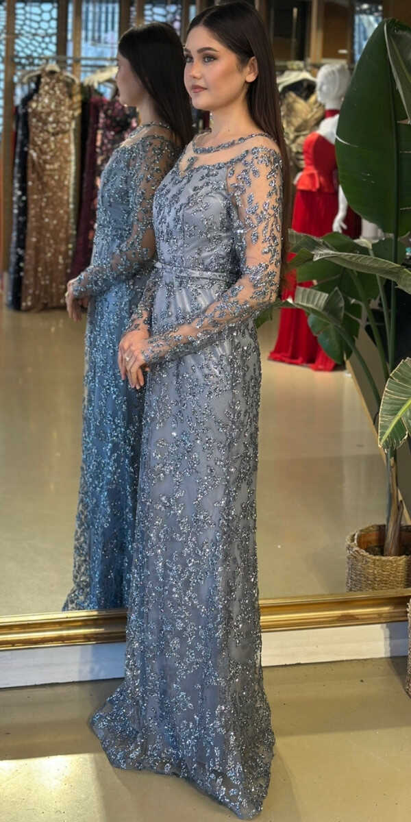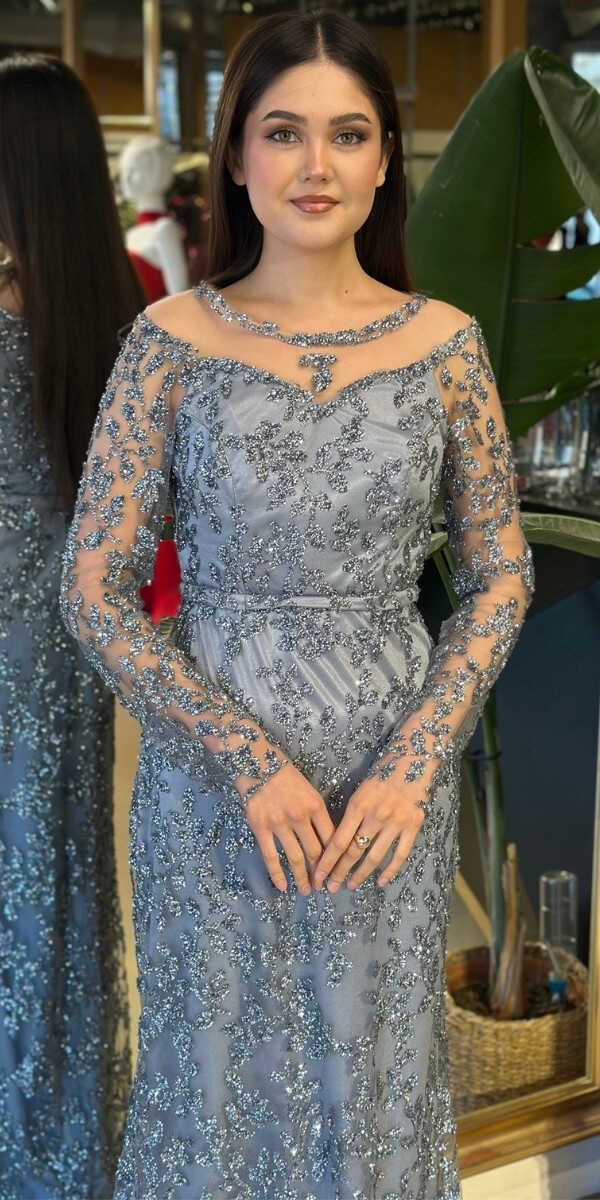 Yuvarlak Yaka Gri Renk Düz Kesim Uzun Abiye Elbise, Simli Kumaştan Üretilmiş olup Simlerin Işıltısıyla Çok Hoş Gözükeceksiniz. Uzun kollarıyla, kollarınızı zarif bir şekilde kapatır.