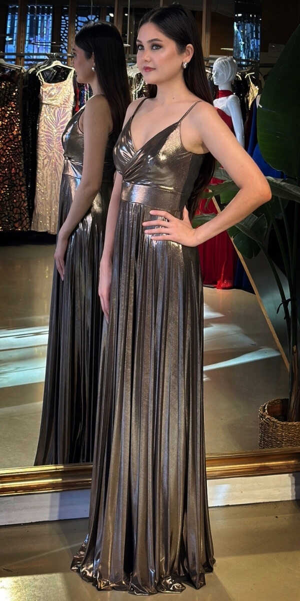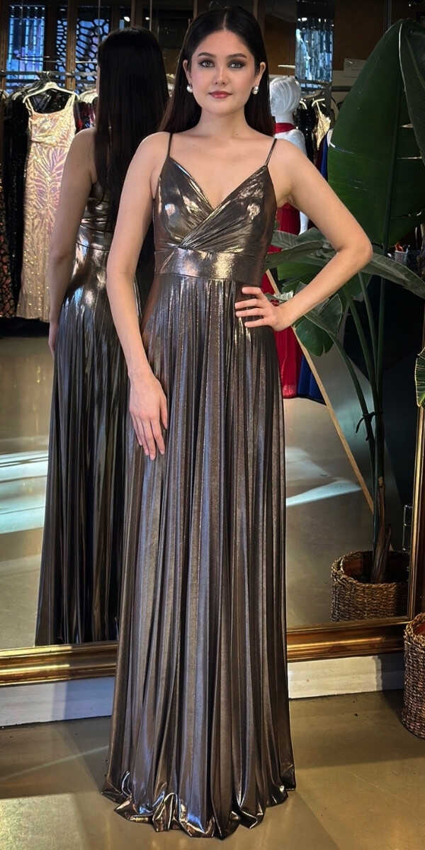 V Yaka Gümüş Renk Kloş Etekli Uzun Abiye Elbise, Parlak Kumaş Kumaştan Üretilmiş olup Parlak dokusu sayesinde her adımda ışıltınızı yansıtın. Elbisedeki İp Askılar Kullanım Kolaylığı Yaratacaktır.