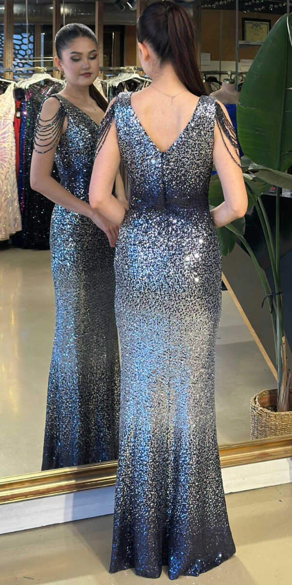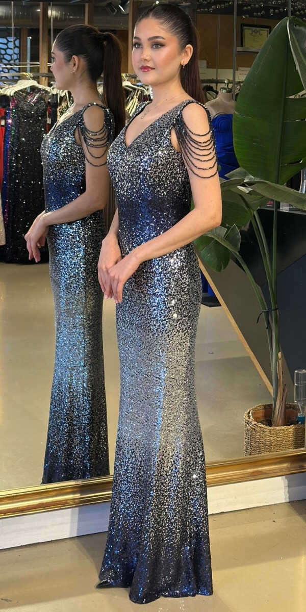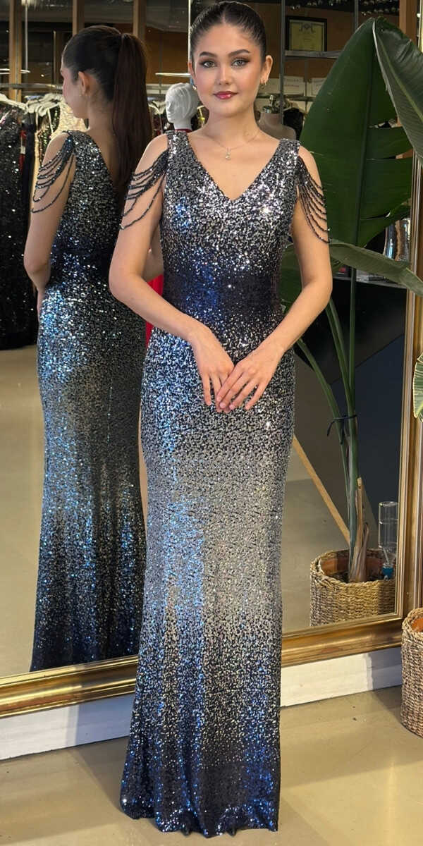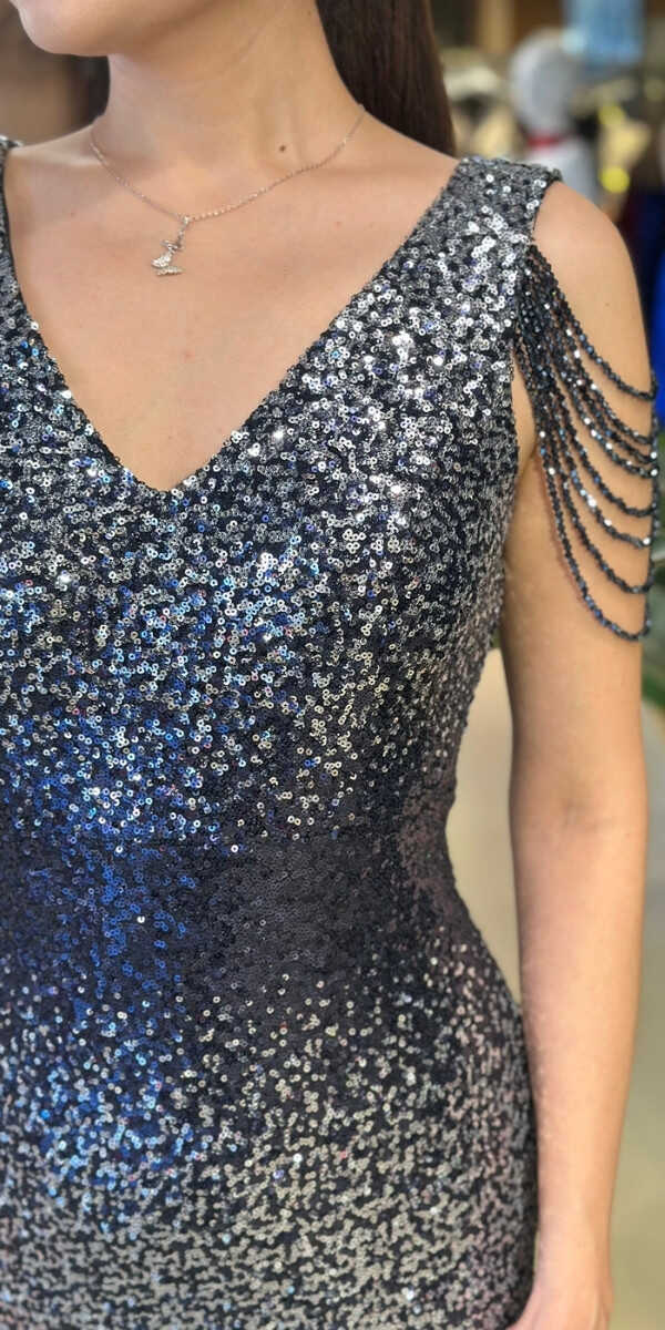 V Yaka Gümüş Renk Düz Kesim Uzun Abiye Elbise, Payet Kumaştan Üretilmiş olup Pırıltısıyla Göz Kamaştıracaktır. Kalın askılı yapısıyla destekleyici ve modern bir görünüm sağlar. Boncuk süslemeleriyle her adımda ışıldar.