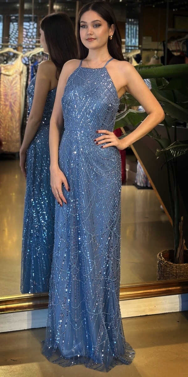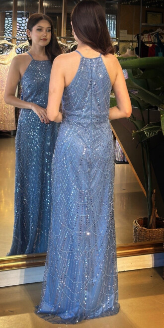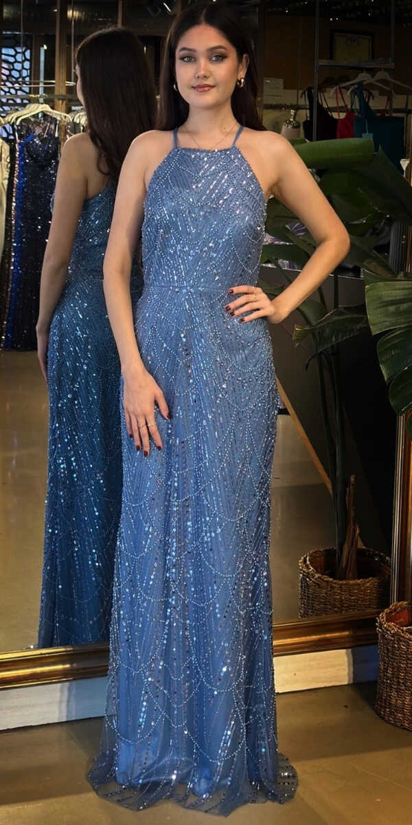 Halter Yaka İndigo Renk Düz Kesim Uzun Abiye Elbise, Pullu Boncuklu Kumaştan Üretilmiş olup Parıltı ve Zarafetin Buluştuğu Kumaş Türü Sizi Işıl Işıl Gösterecektir. Elbisedeki İp Askılar Kullanım Kolaylığı Yaratacaktır.