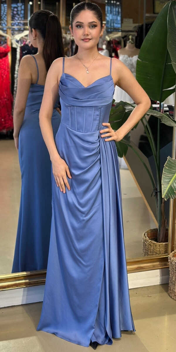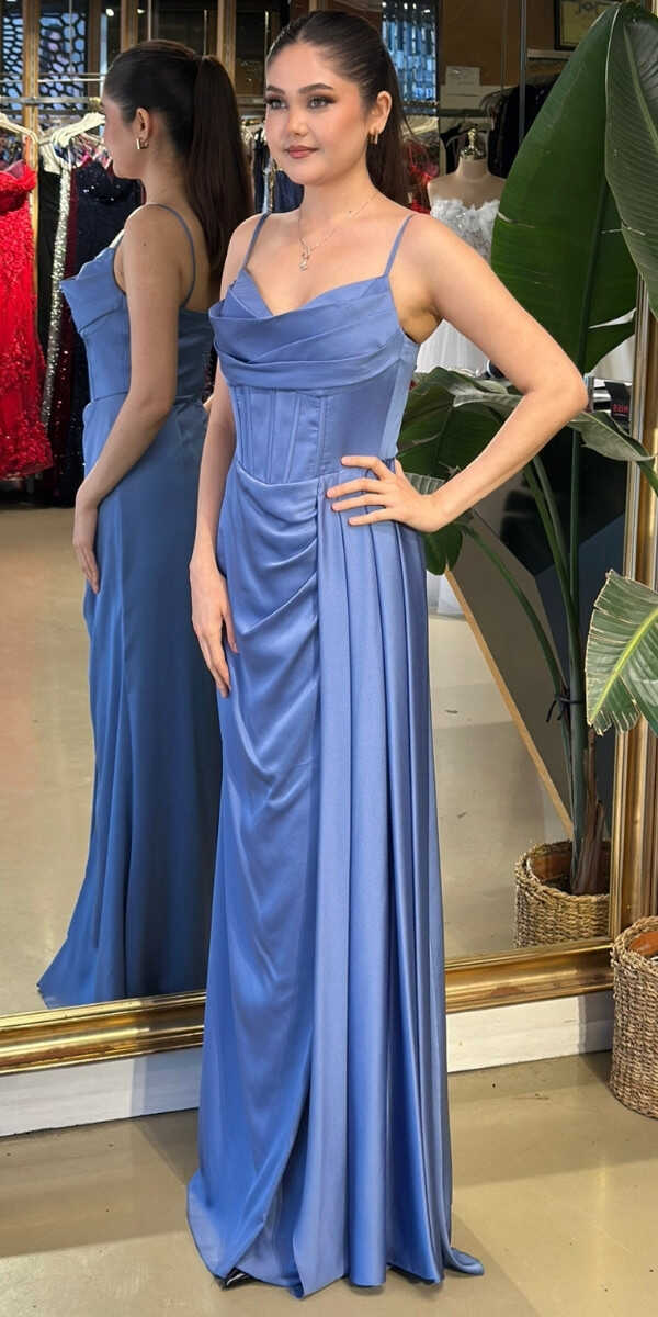 İndigo İnce Askılı Yırtmaçlı Düz Kesim Saten Uzun Abiye Elbise 7564