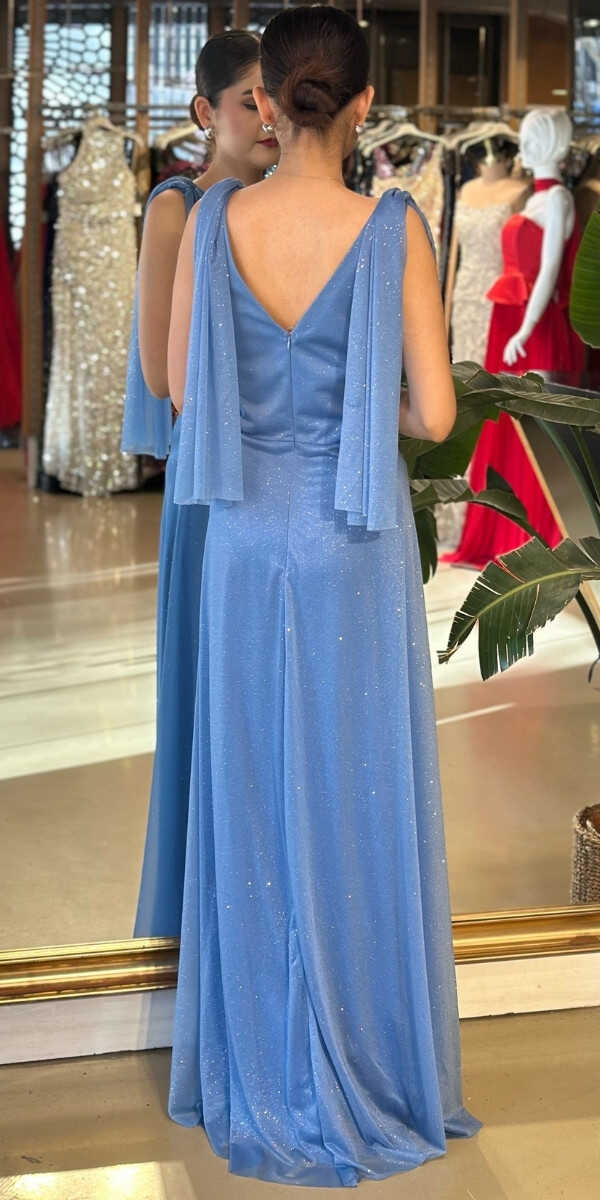 İndigo Kalın Askı Yırtmaçlı Kloş Etekli Simli Uzun Abiye Elbise 7205
