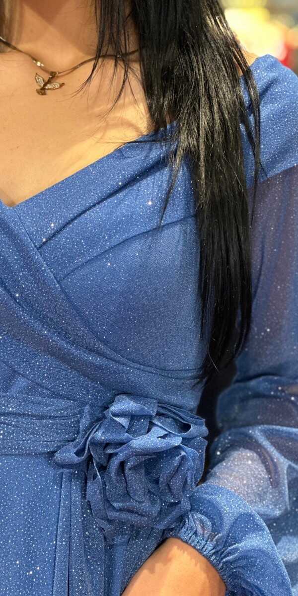 İndigo Renk Kloş Etekli Uzun Abiye Elbise, Simli Kumaştan Üretilmiş Olup Simlerin Işıltısıyla Çok Hoş Gözükeceksiniz Çiçek Detayı Modern Bir Görünüm Yaratacaktır..