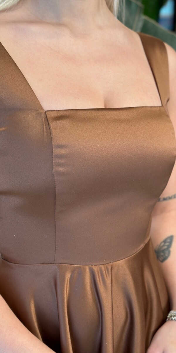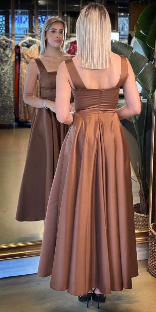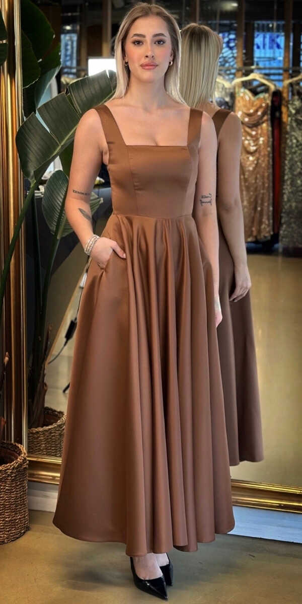 Kahverengi Renk Kloş Etekli Midi Abiye Elbise, Saten Kumaştan Üretilmiş Olup Satenin Pürüzsüz Işığı Görünümünüze Zarafet Katacaktır.
