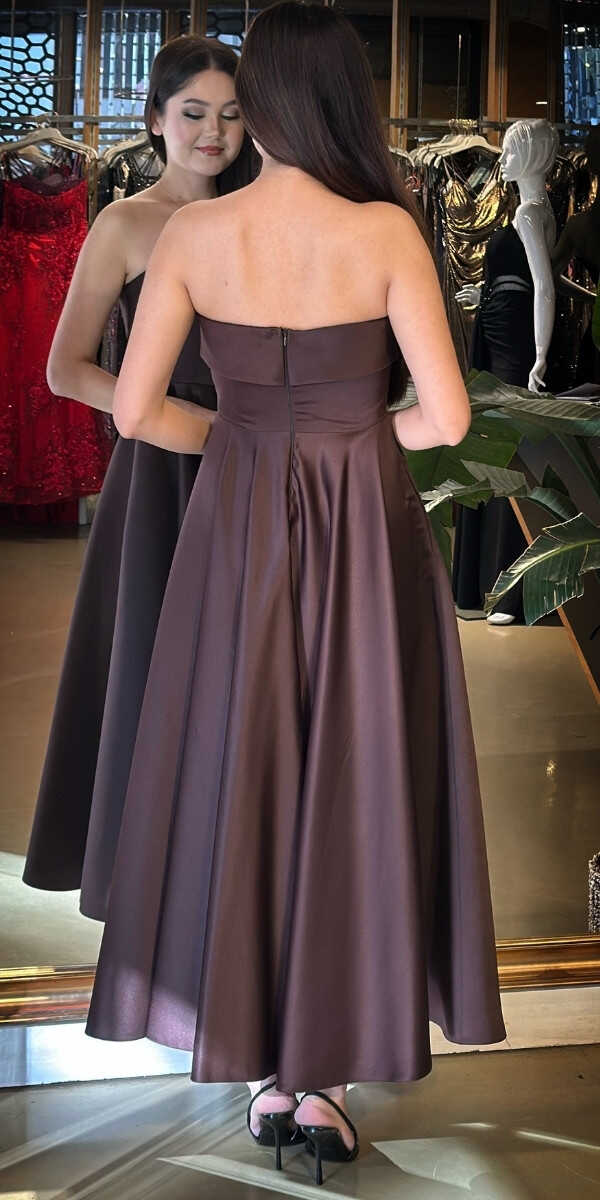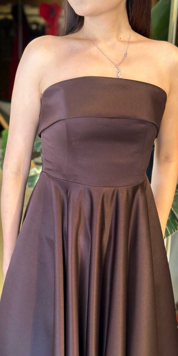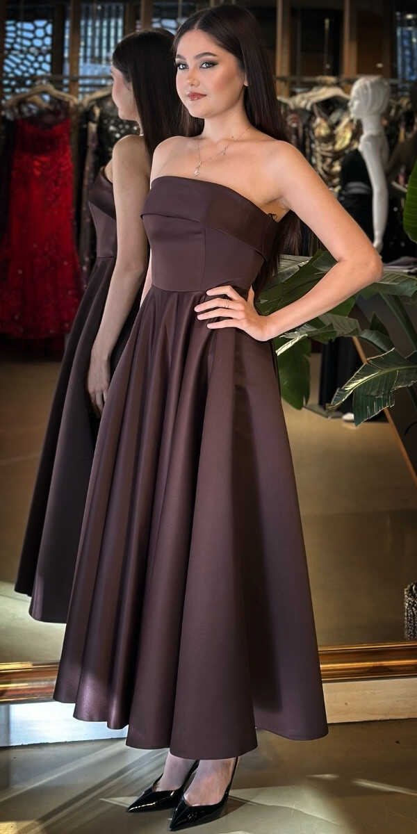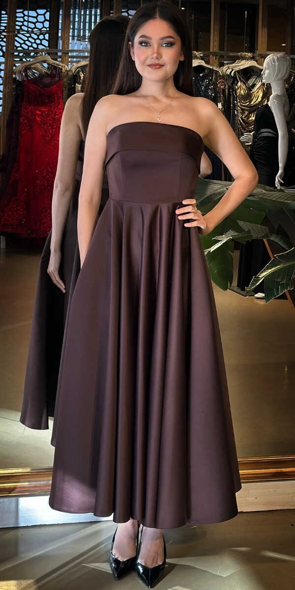 Kare Yaka Kahverengi Renk Kloş Etekli Midi Abiye Elbise, Saten Kumaştan Üretilmiş olup Satenin Pürüzsüz Işığı Görünümünüze Zarafet Katacaktır. Kalın askılı yapısıyla destekleyici ve modern bir görünüm sağlar.