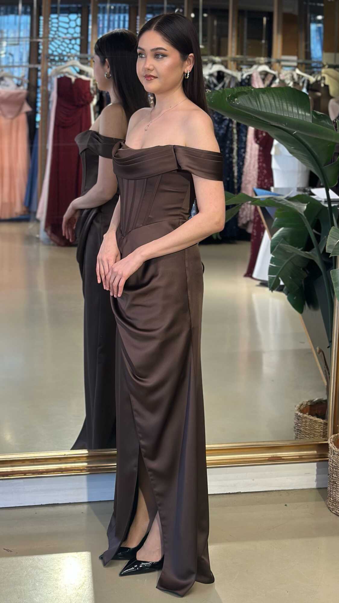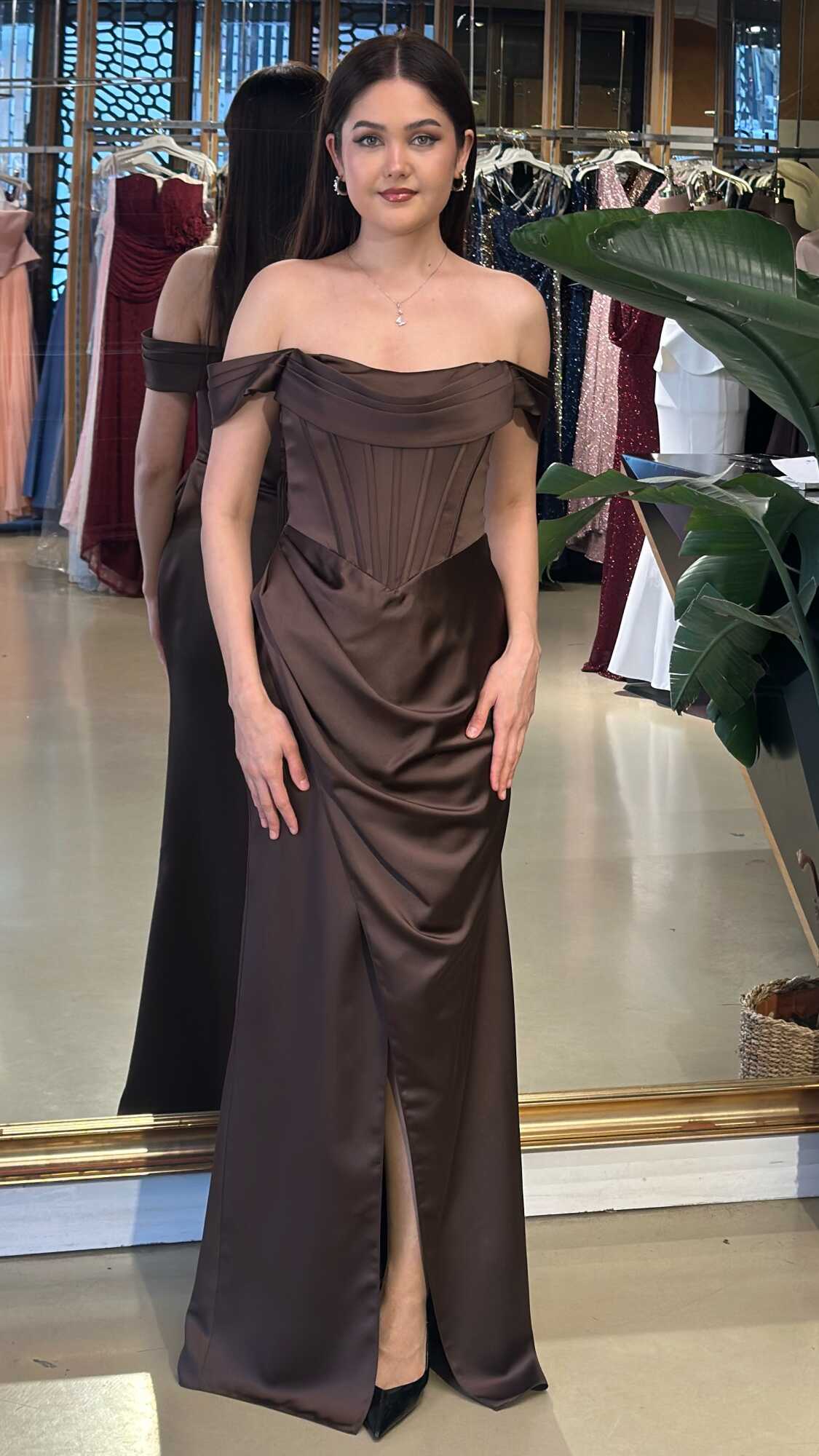 Gelince Haber VerMadonna Yaka Kahverengi Renk Düz Kesim Uzun Abiye Elbise, Saten Kumaştan Üretilmiş olup Satenin Pürüzsüz Işığı Görünümünüze Zarafet Katacaktır. Şık Sırt Dekoltesi Size Çok Yakışacak. Yırtmaç Detayı Cesur ve Çarpıcı Bir Stil Sunacaktır.
