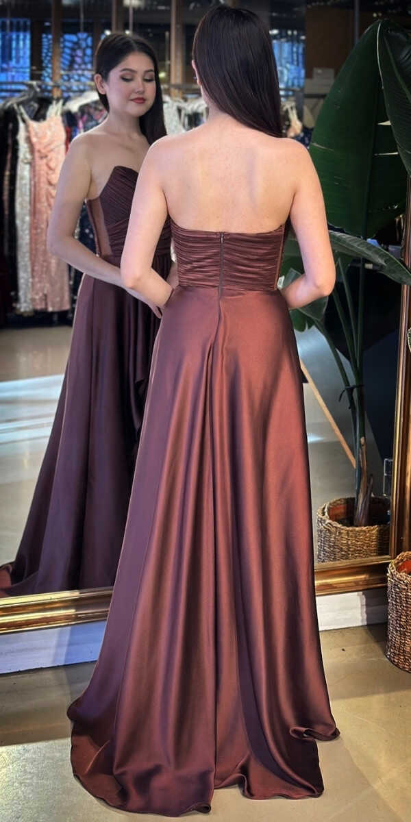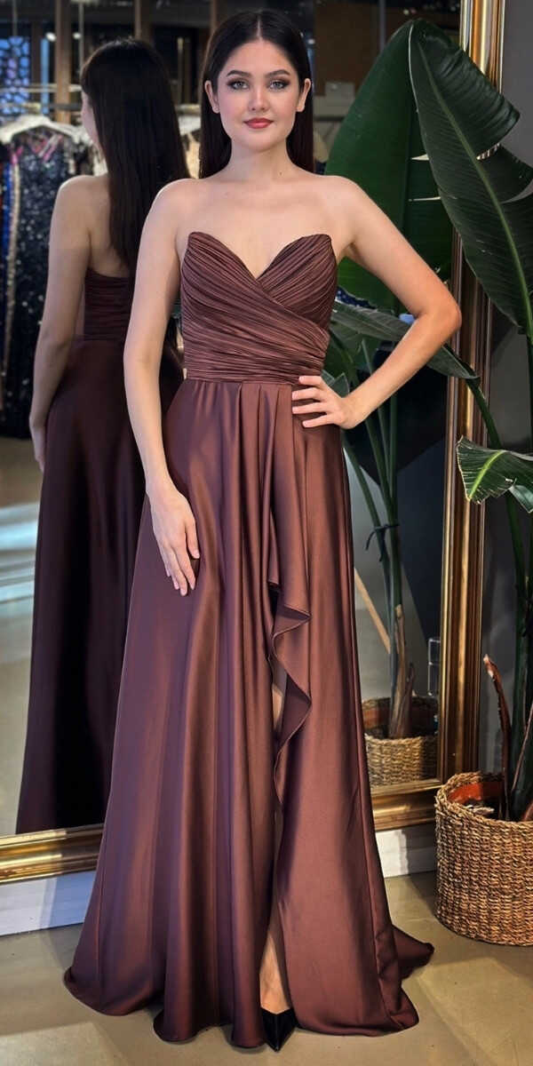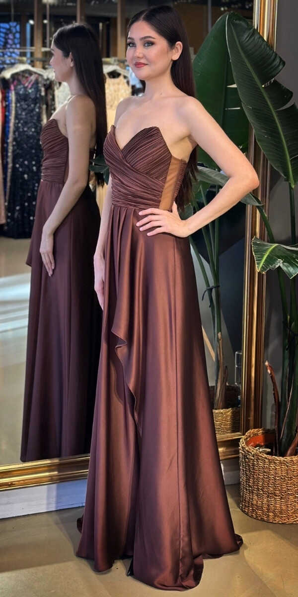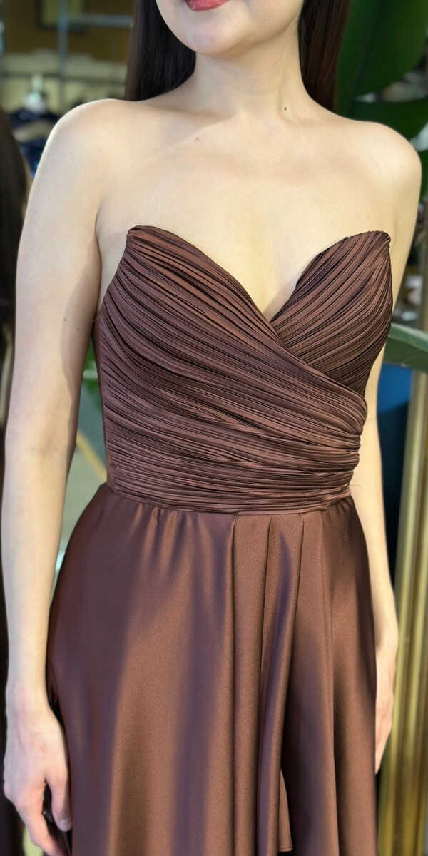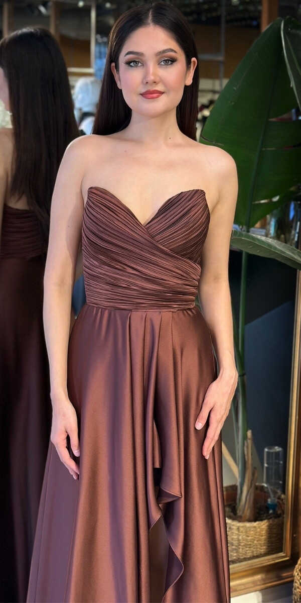 Straplez Yaka Kahverengi Renk Kloş Etekli Uzun Abiye Elbise, Saten Kumaştan Üretilmiş olup Satenin Pürüzsüz Işığı Görünümünüze Zarafet Katacaktır. Adeta Göz Kamaştıran Bir Görünüm Yaratacak.