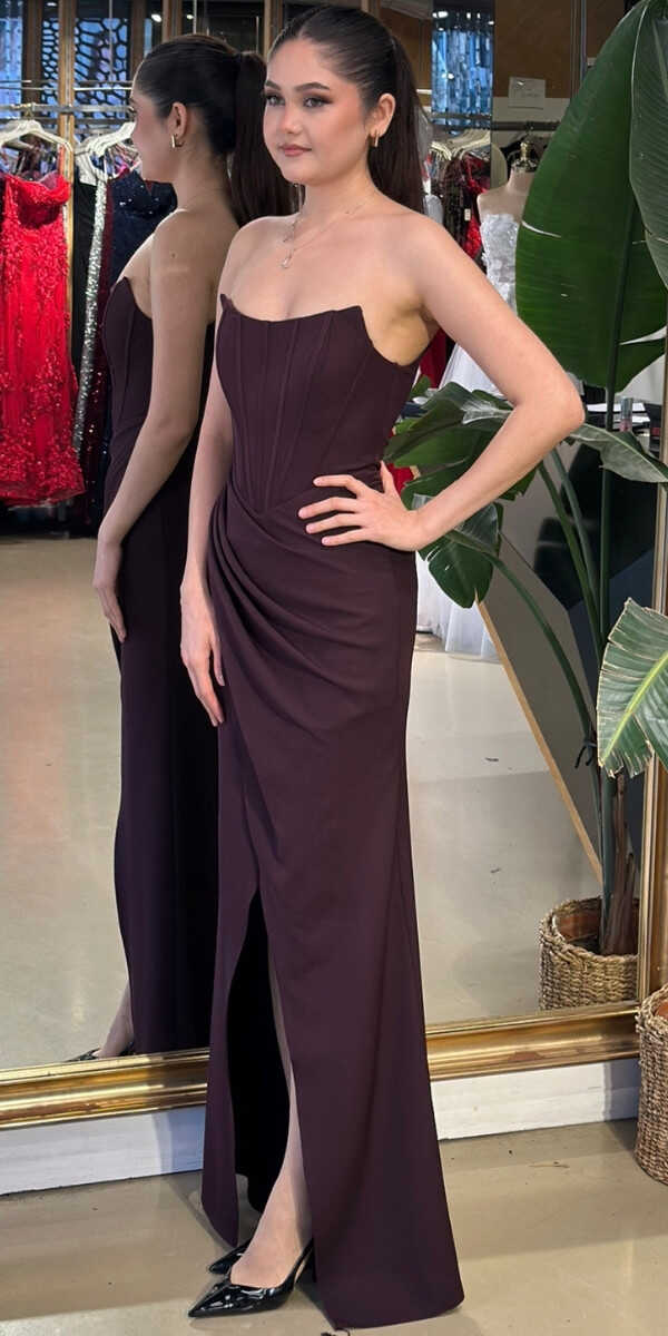 Gelince Haber VerStraplez Yaka Kahverengi Renk Düz Kesim Uzun Abiye Elbise, Krep Kumaştan Üretilmiş olup Hafif Ve Daha Az Kırışan Krep Kumaş Sizi Daha Rahat Hissettirecektir. Şık Sırt Dekoltesi Size Çok Yakışacak. Yırtmaç Detayı Cesur ve Çarpıcı Bir Stil Sunacaktır.