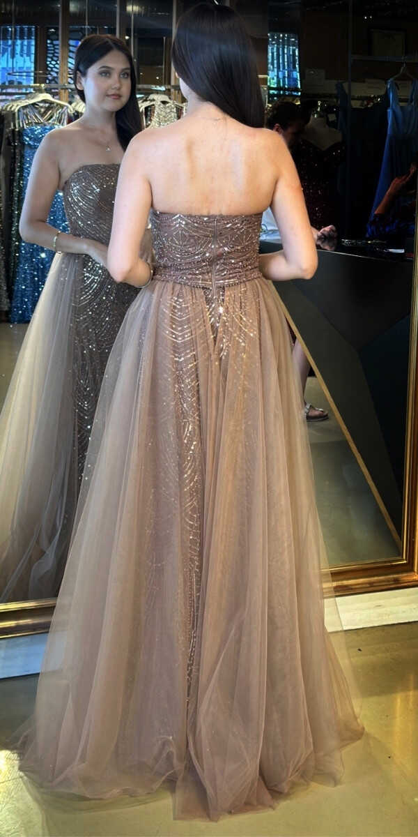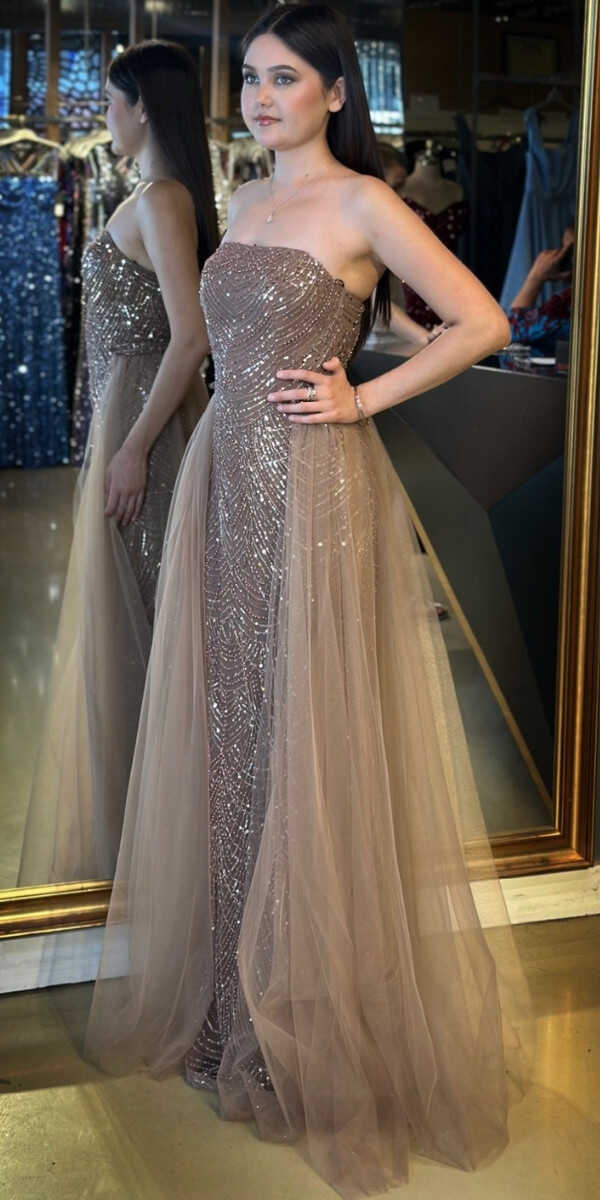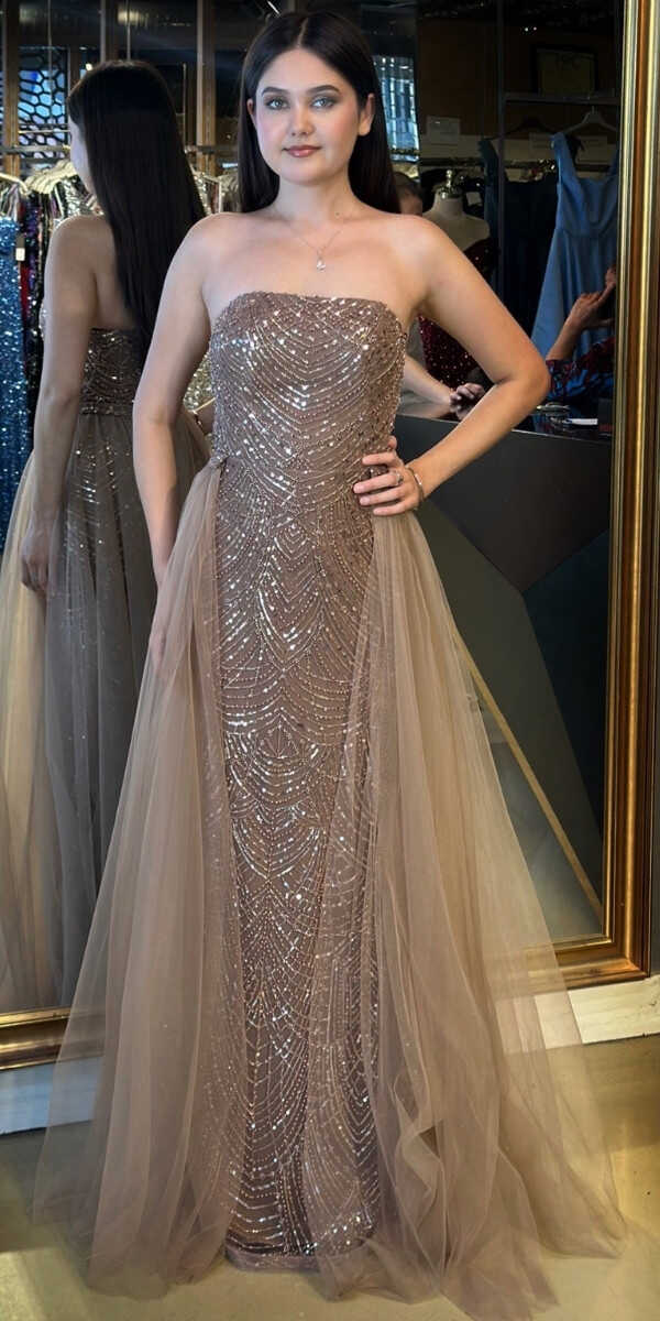 Kahverengi Renk Tül Pelerin Etekli Uzun Abiye Elbise, Pullu Boncuklu Kumaştan Üretilmiş olup Parıltı ve Zarafetin Buluştuğu Kumaş Türü Sizi Işıl Işıl Gösterecektir.