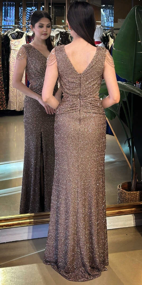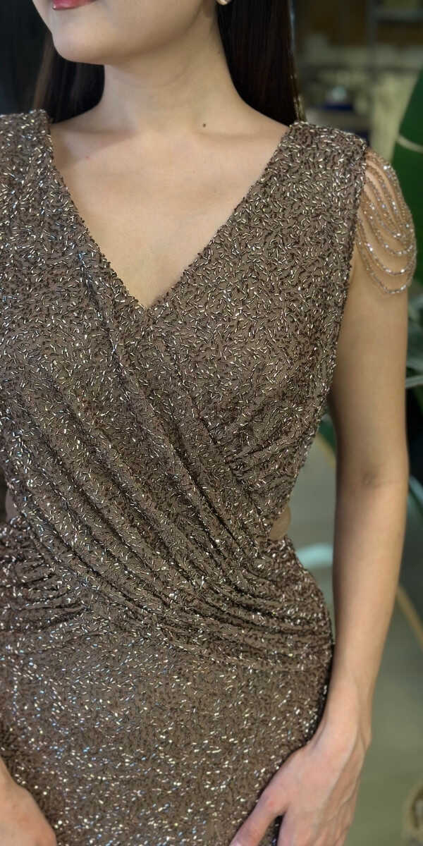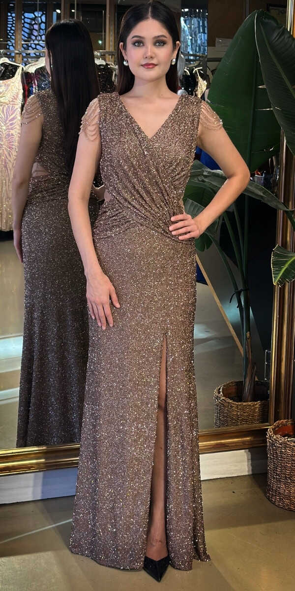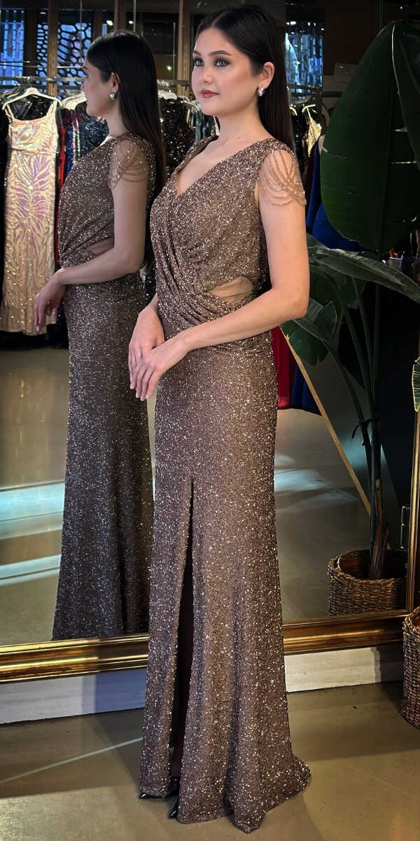 Gelince Haber VerV Yaka Kahverengi Renk Düz Kesim Uzun Abiye Elbise, Pullu Boncuklu Kumaştan Üretilmiş olup Parıltı ve Zarafetin Buluştuğu Kumaş Türü Sizi Işıl Işıl Gösterecektir. Vücuda uyum sağlayan likralı kumaş, dinamik bir duruş kazandırır. Kalın askılı yapısıyla destekleyici ve modern bir görünüm sağlar. Yırtmaç Detayı Cesur ve Çarpıcı Bir Stil Sunacaktır.