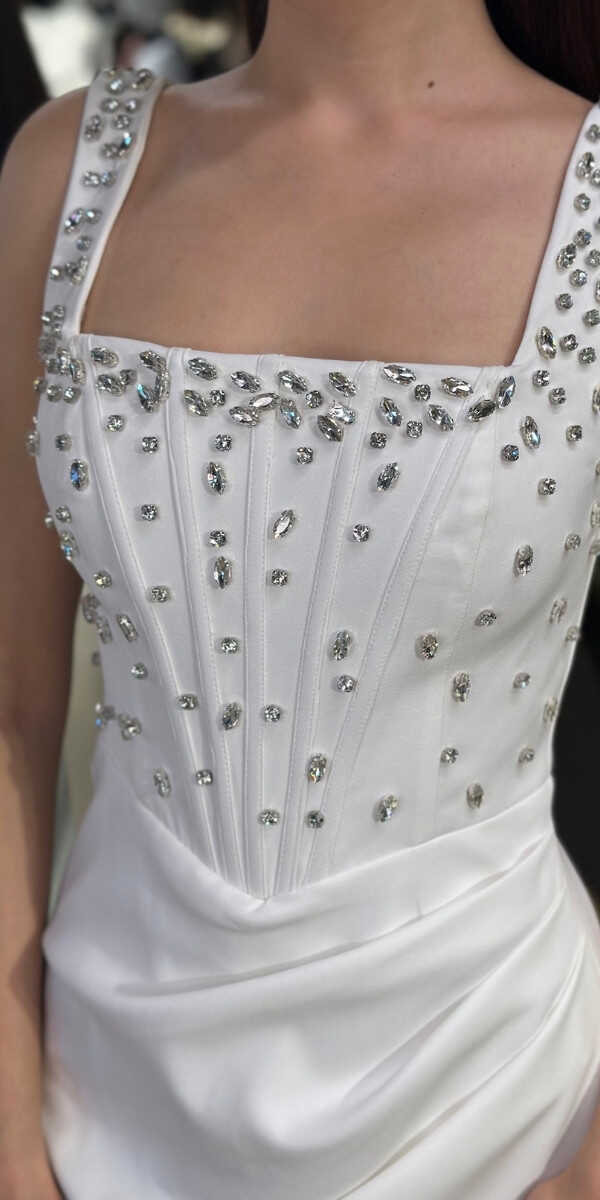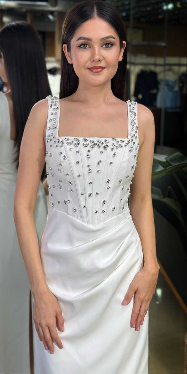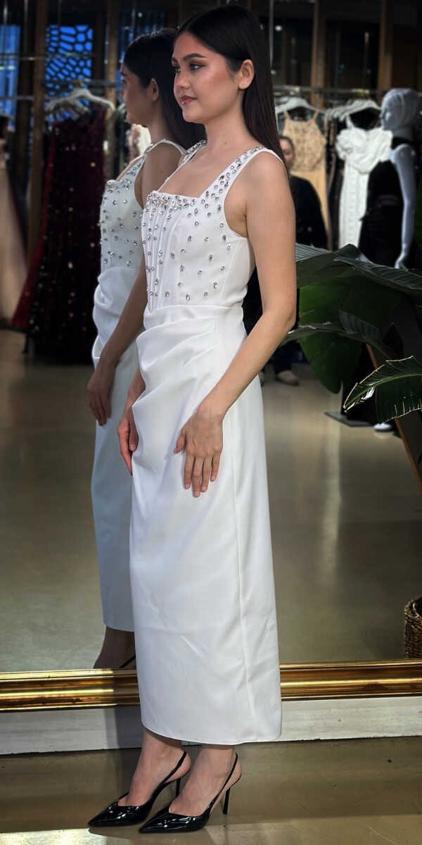 Gelince Haber VerKare Yaka Kırık Beyaz Renk Düz Kesim Midi Abiye Elbise, Krep Kumaştan Üretilmiş olup Hafif Ve Daha Az Kırışan Krep Kumaş Sizi Daha Rahat Hissettirecektir. Kalın askılı yapısıyla destekleyici ve modern bir görünüm sağlar. Taşlı Aksesuar Dikkatleri Üzerinizde Toplayacak. Yırtmaç Detayı Cesur ve Çarpıcı Bir Stil Sunacaktır.