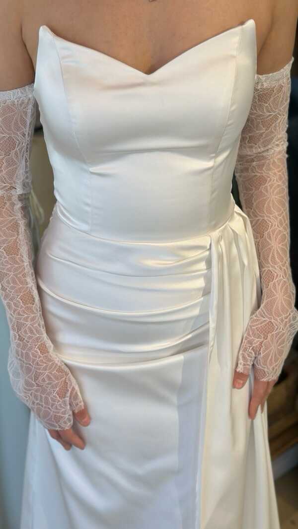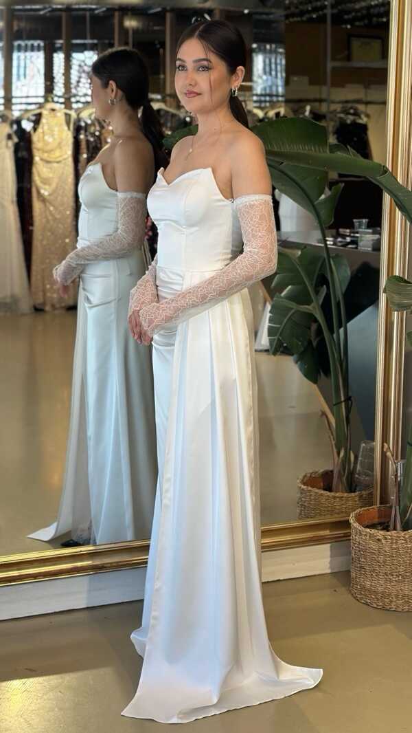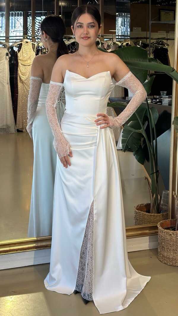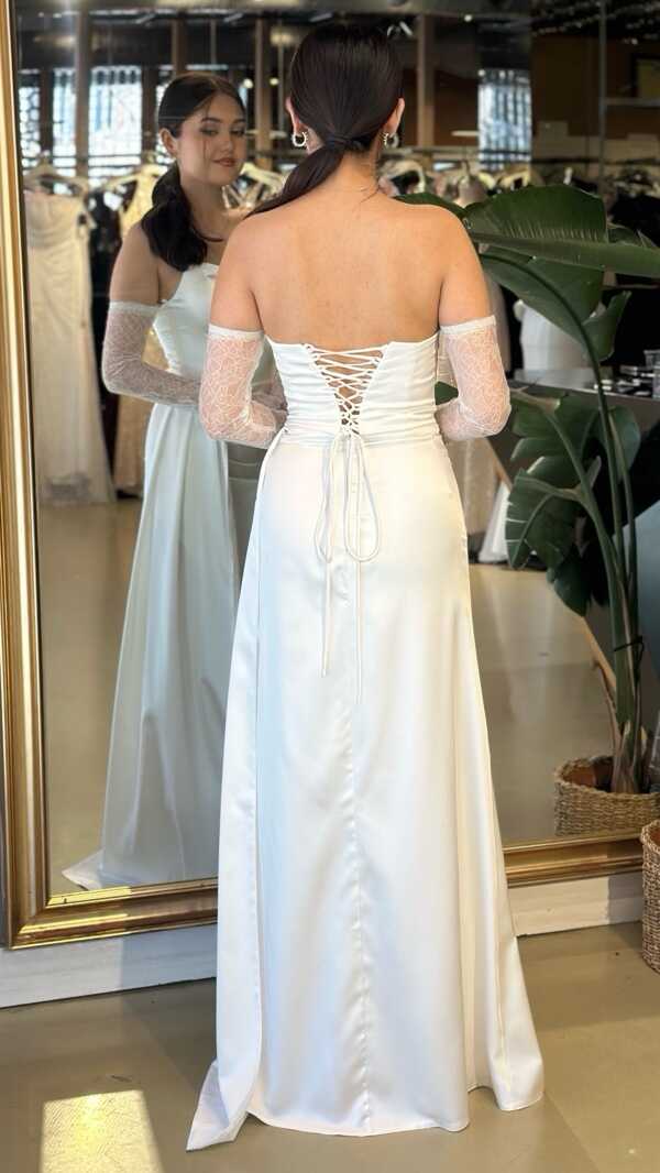 Straplez Yaka Kırık Beyaz Renk Düz Kesim Uzun Abiye Elbise, Saten Kumaştan Üretilmiş olup Satenin Pürüzsüz Işığı Görünümünüze Zarafet Katacaktır. Yırtmaç Detayı Cesur ve Çarpıcı Bir Stil Sunacaktır.