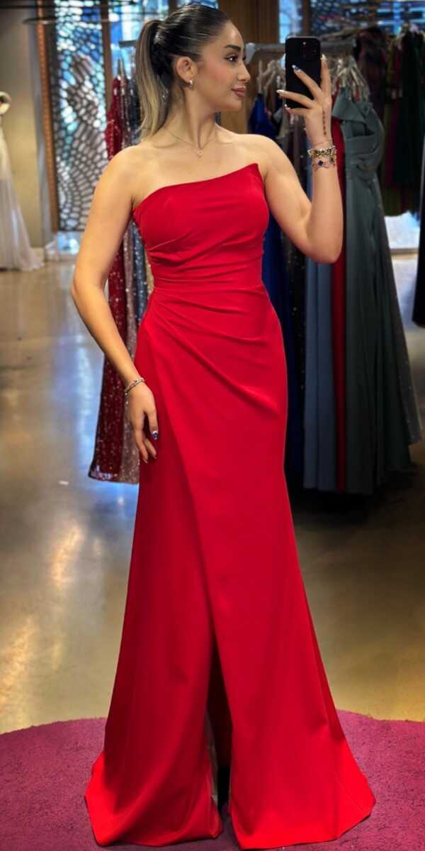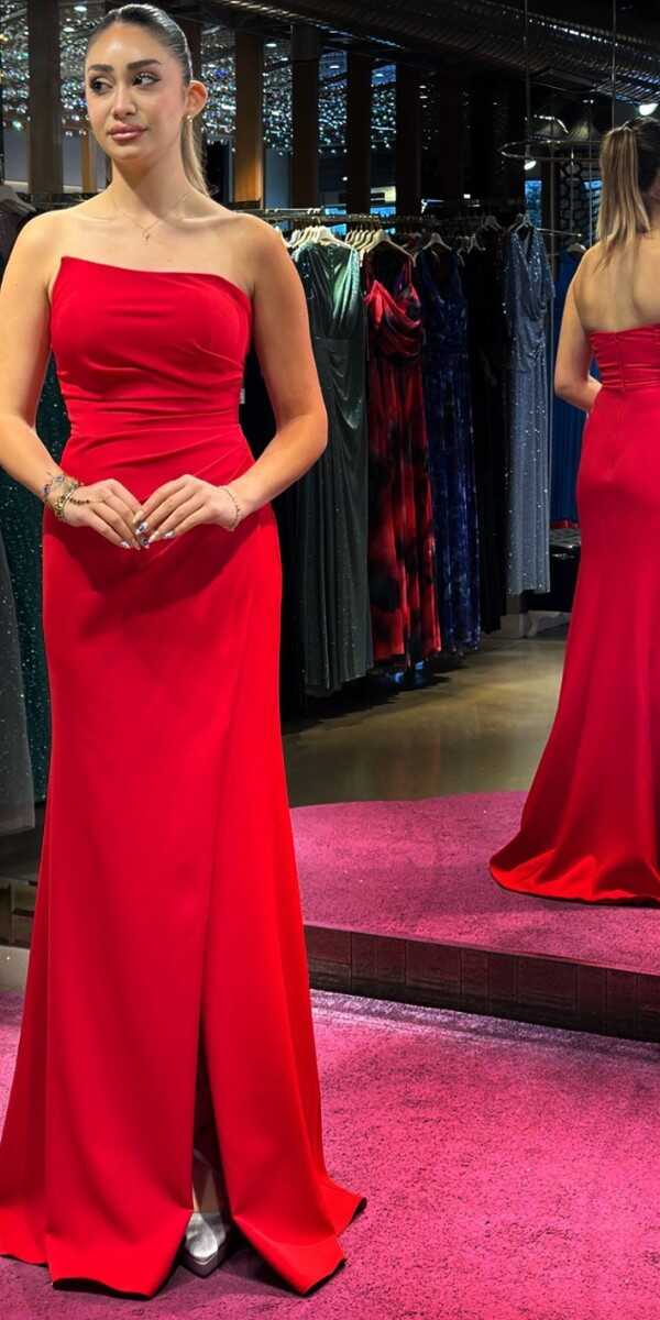 Kırmızı Anvelop Yırtmaçlı Düz Kesim Krep Uzun Abiye Elbise 7324