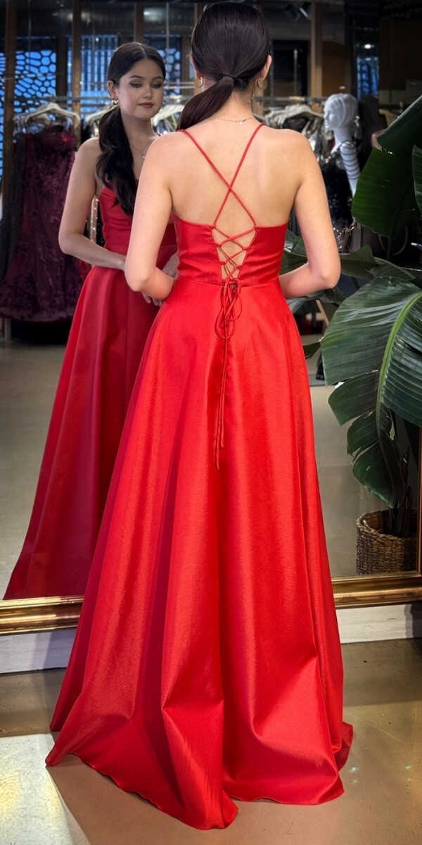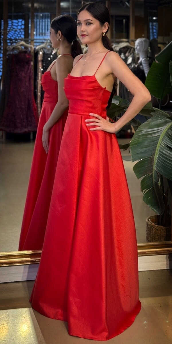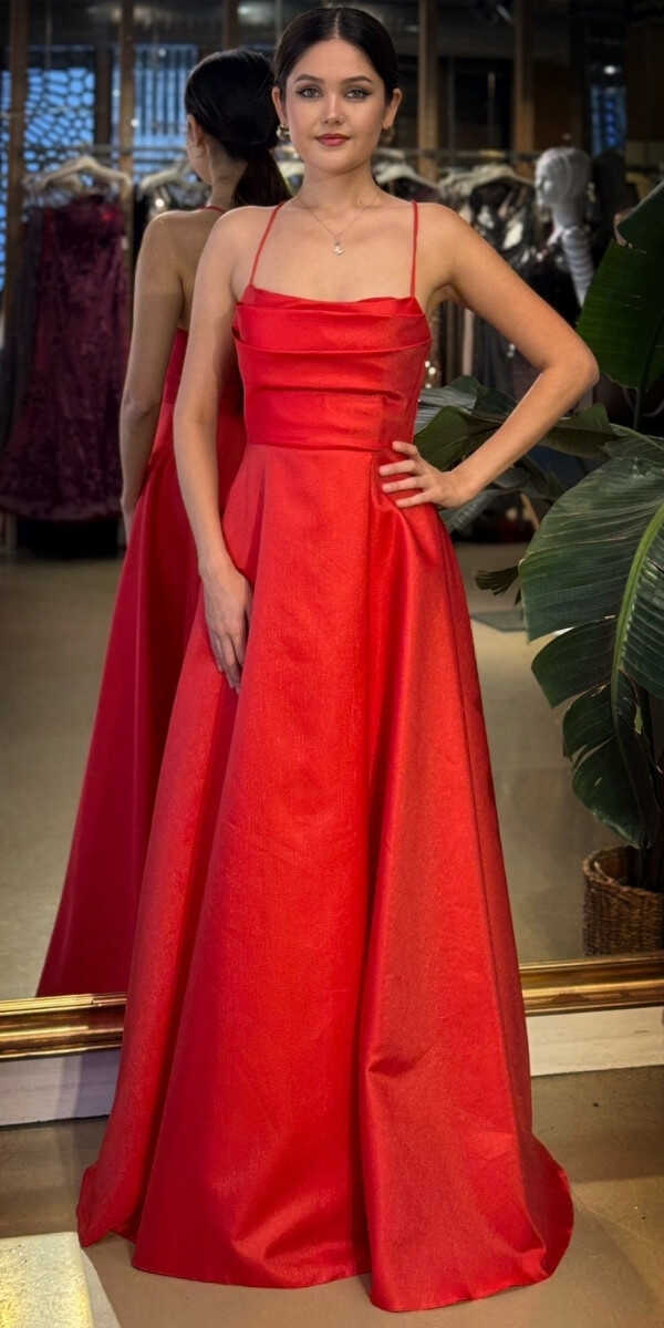 Degaje Yaka Kırmızı Renk Kloş Etekli Uzun Abiye Elbise, Saten Kumaştan Üretilmiş olup Satenin Pürüzsüz Işığı Görünümünüze Zarafet Katacaktır. Elbisedeki İp Askılar Kullanım Kolaylığı Yaratacaktır. Şık Sırt Dekoltesi Size Çok Yakışacak.