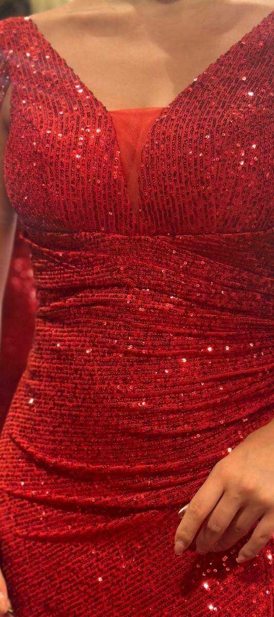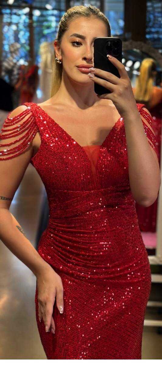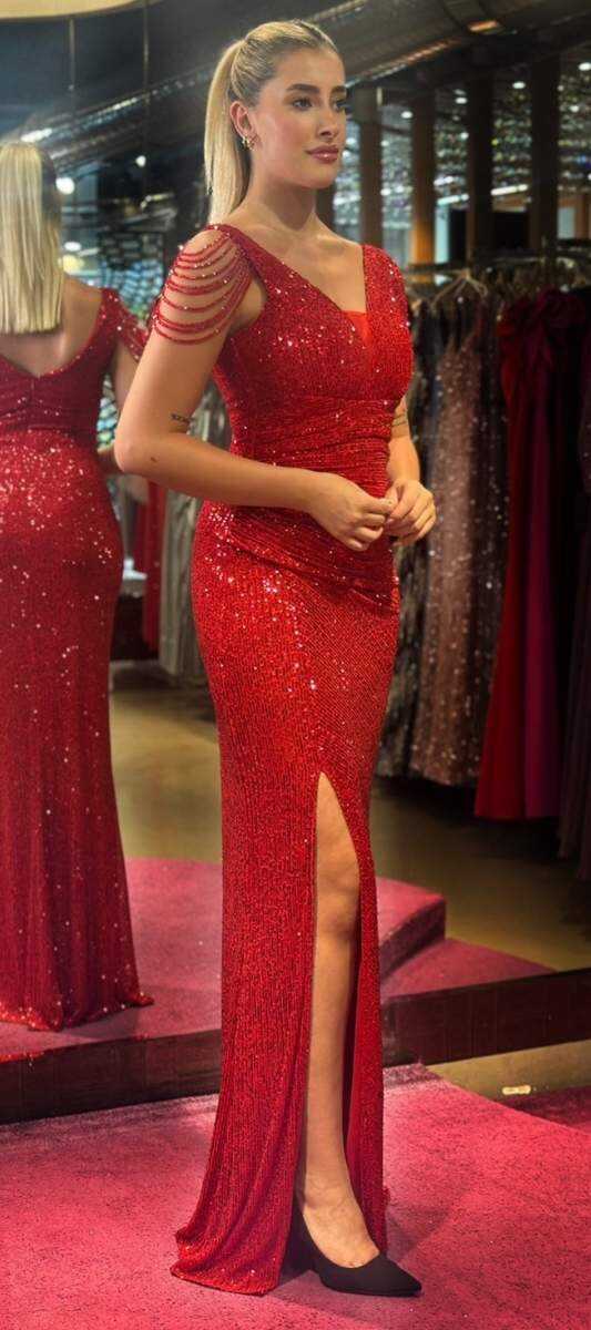 Kırmızı Renk Düz Kesim Uzun Abiye Elbise, Payet Kumaştan Üretilmiş olup Pırıltısıyla Göz Kamaştıracaktır. Yırtmaç Detayı Cesur ve Çarpıcı Bir Stil Sunacaktır.