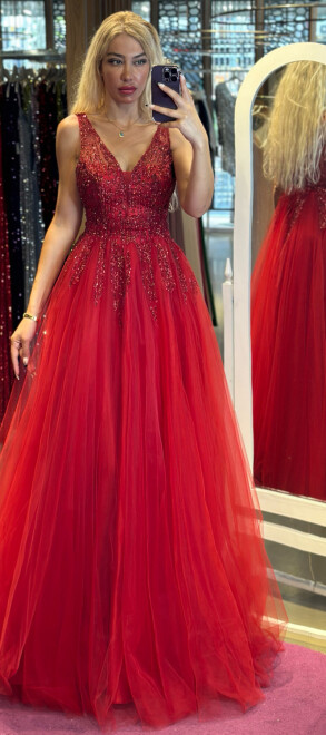 Kırmızı Renk Kloş Etekli Uzun Abiye Elbise, Tül Kumaştan Üretilmiş Olup Hafif Olmasından Kaynaklı Sizi Gece Boyu Rahat Hissettirecek.