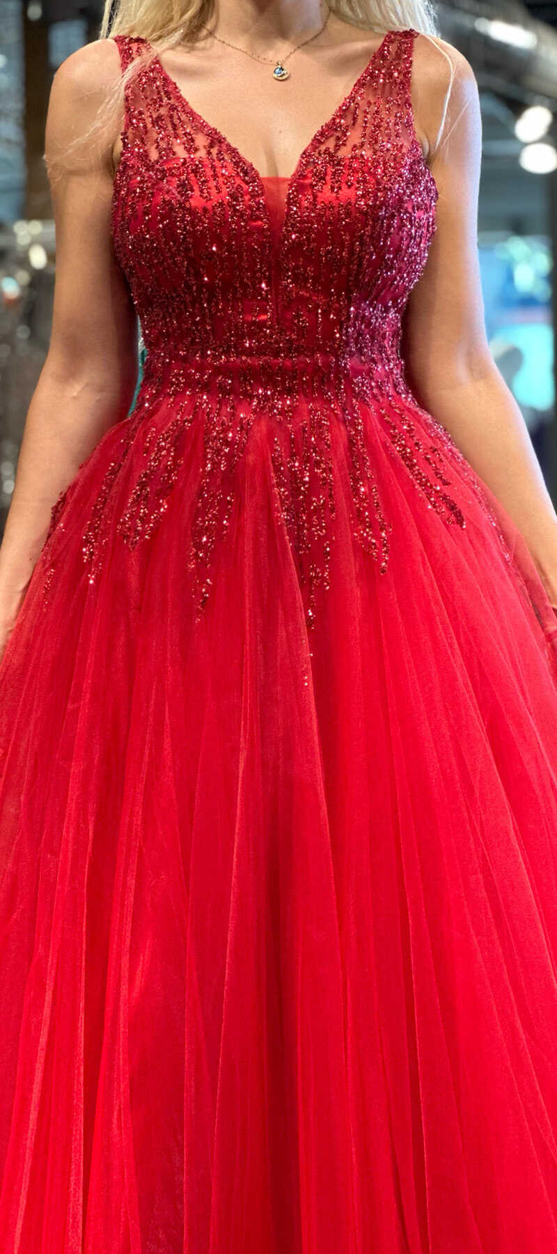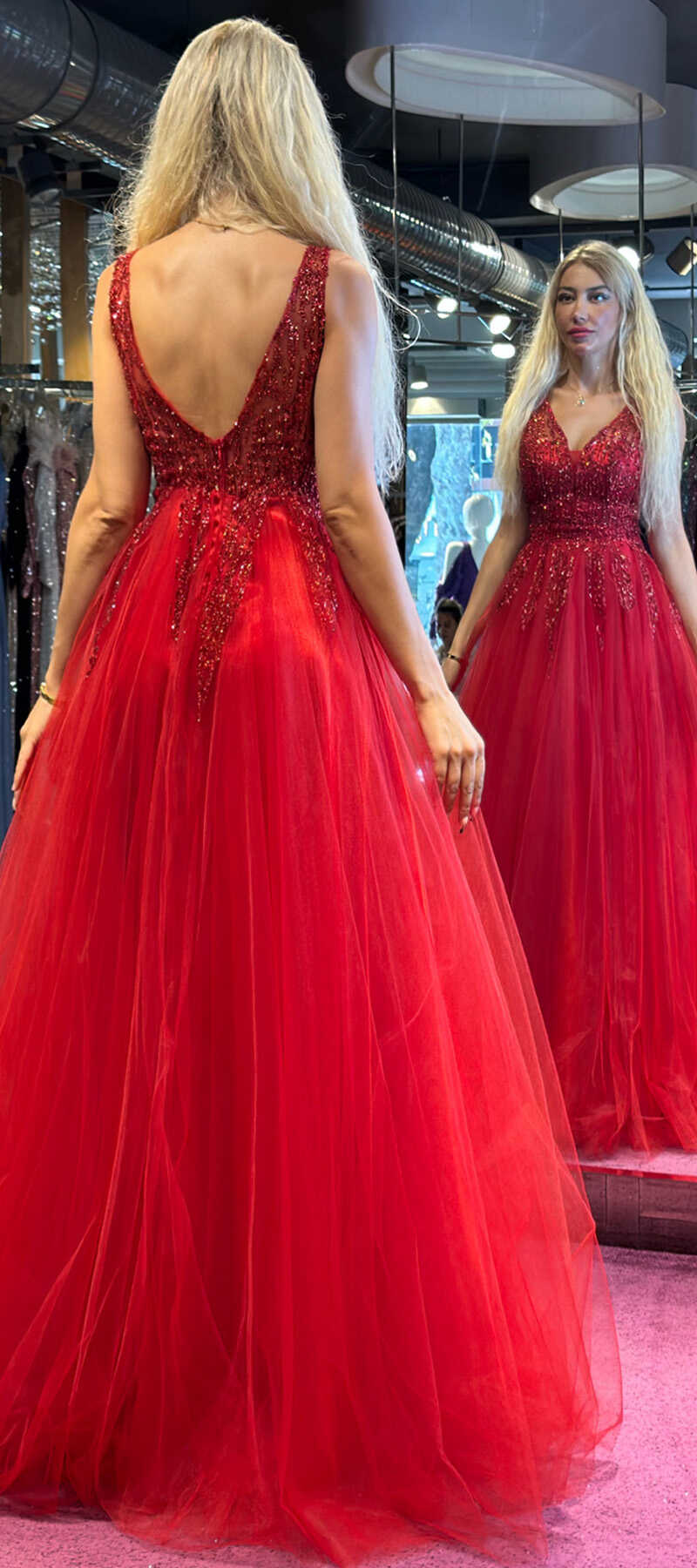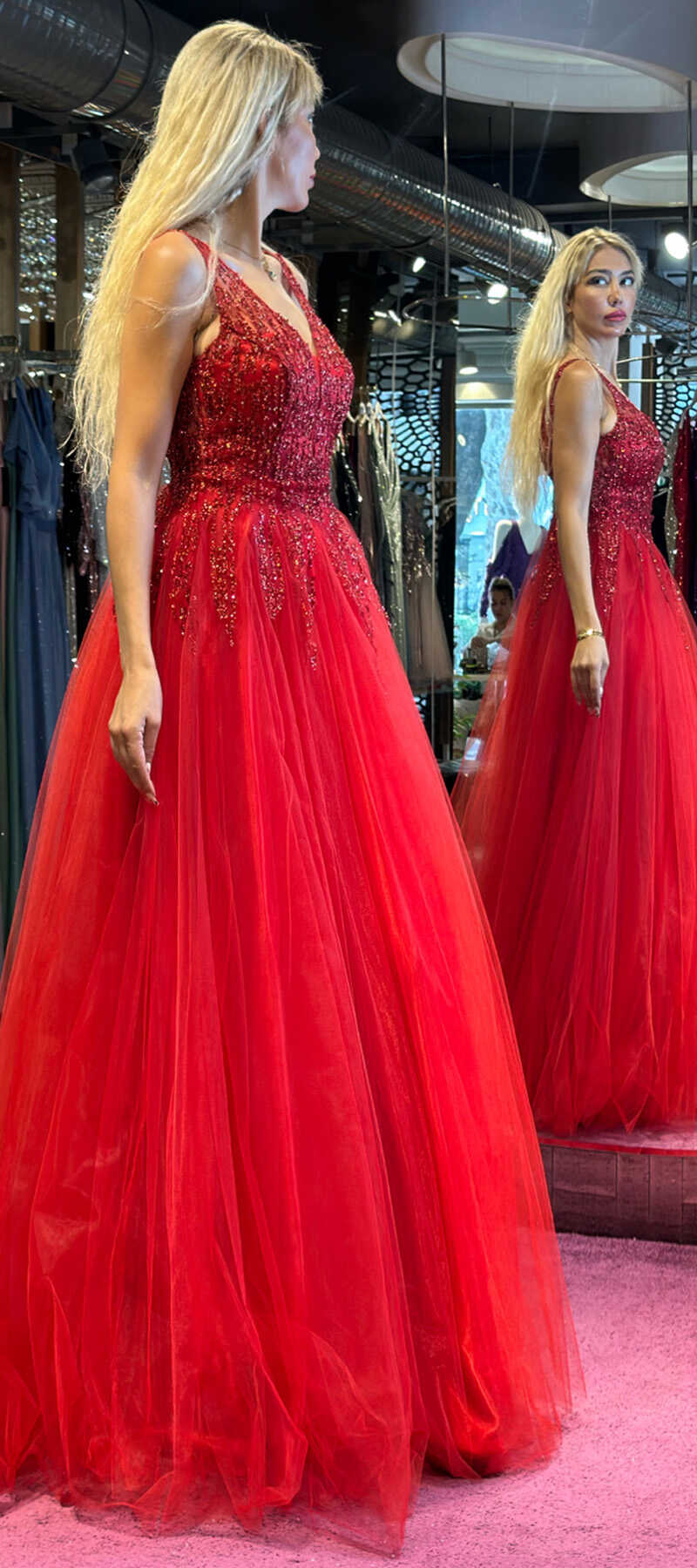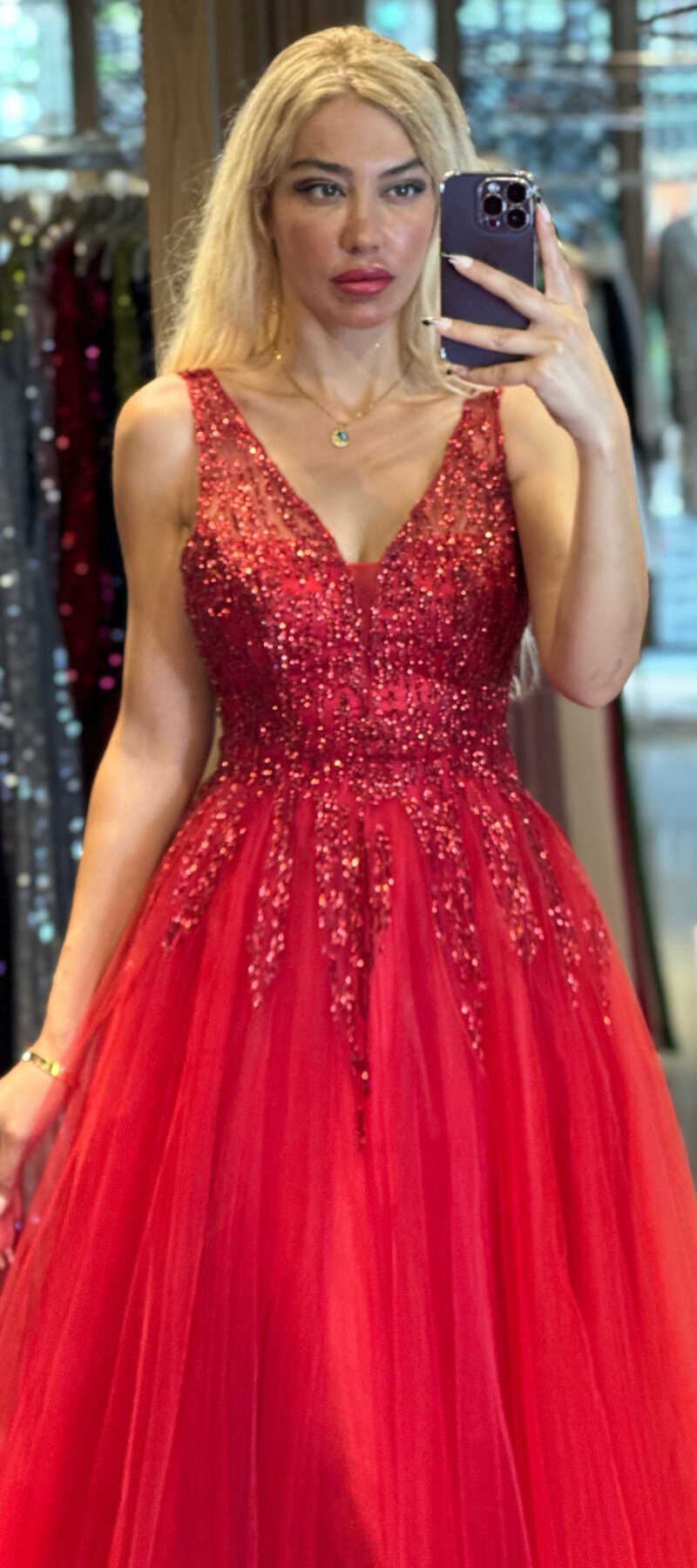 Kırmızı V Yaka Kalın Askı Anvelop Yırtmaçlı Düz Kesim Likralı Tül Uzun Abiye Elbise 11123-02
