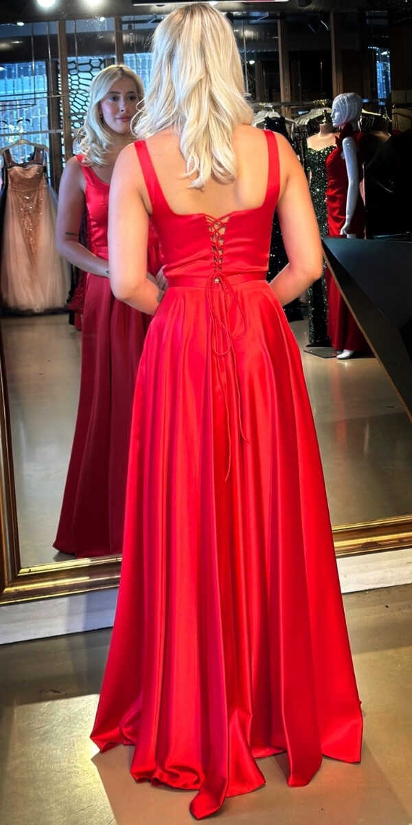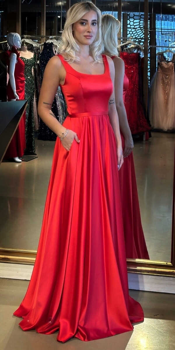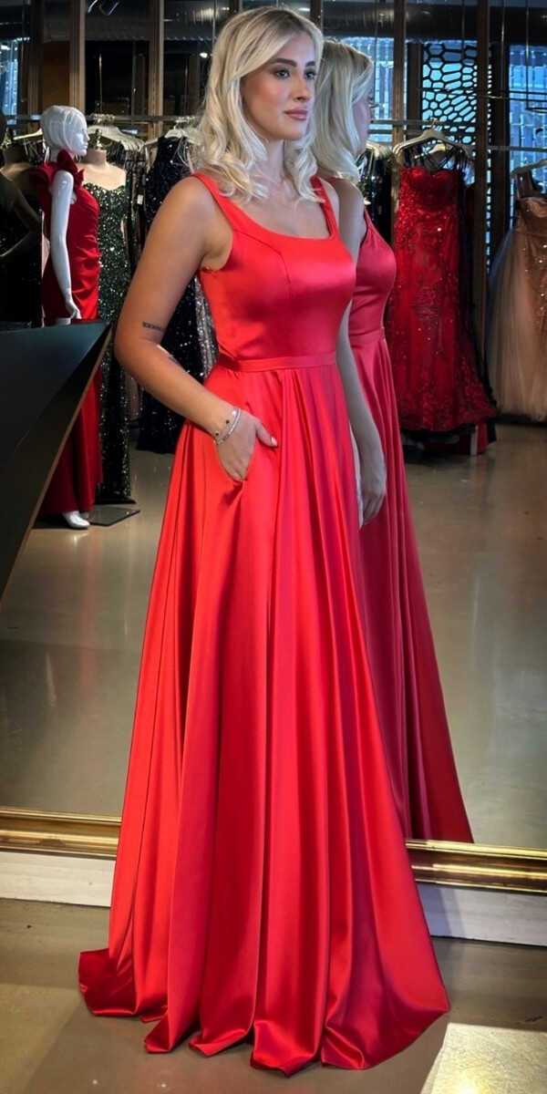 Kırmızı Renk Kloş Etekli Uzun Abiye Elbise, Saten Kumaştan Üretilmiş olup Satenin Pürüzsüz Işığı Görünümünüze Zarafet Katacaktır. Şık Sırt Dekoltesi Size Çok Yakışacak.