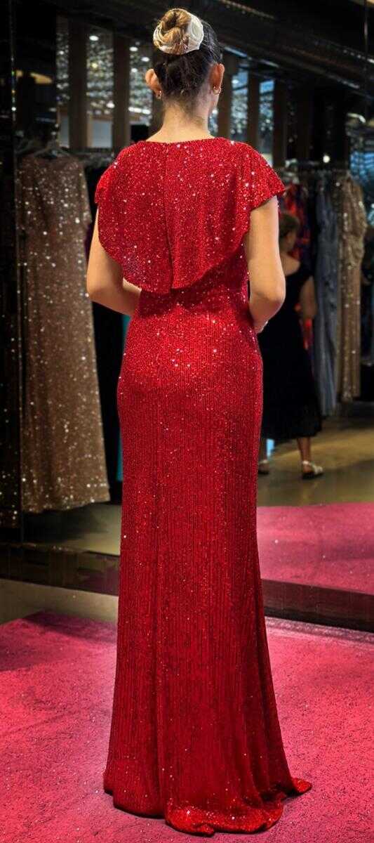 Kırmızı Kısa Kollu Düz Kesim Payet Uzun Abiye Elbise 7499