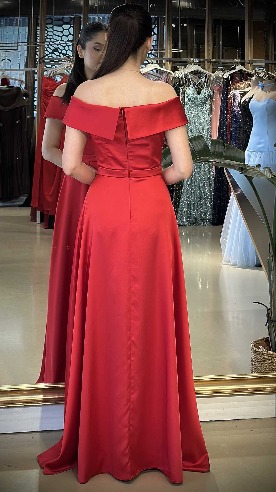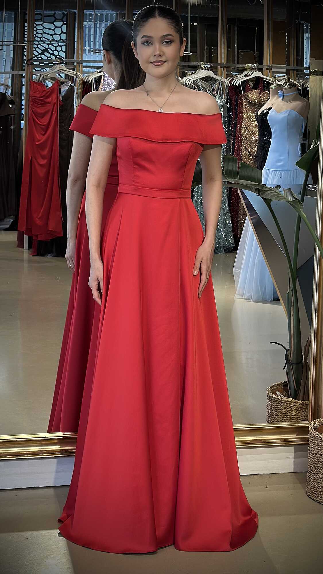 Madonna Yaka Kırmızı Renk Kloş Etekli Uzun Abiye Elbise, Saten Kumaştan Üretilmiş olup Satenin Pürüzsüz Işığı Görünümünüze Zarafet Katacaktır.