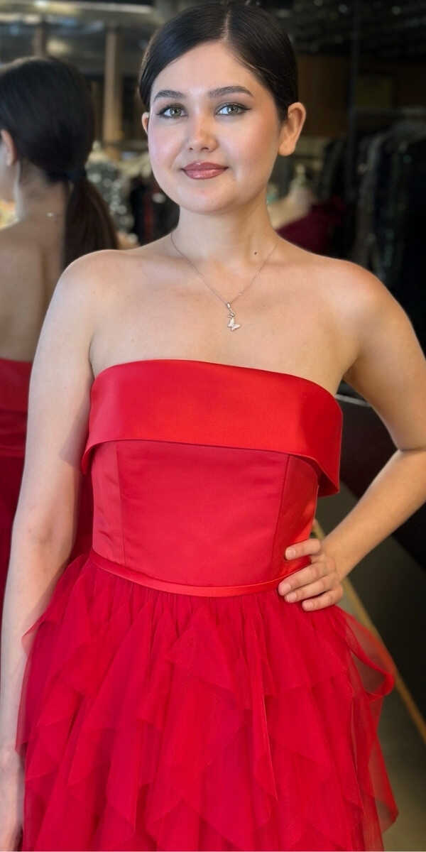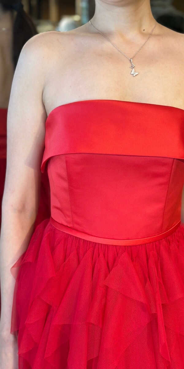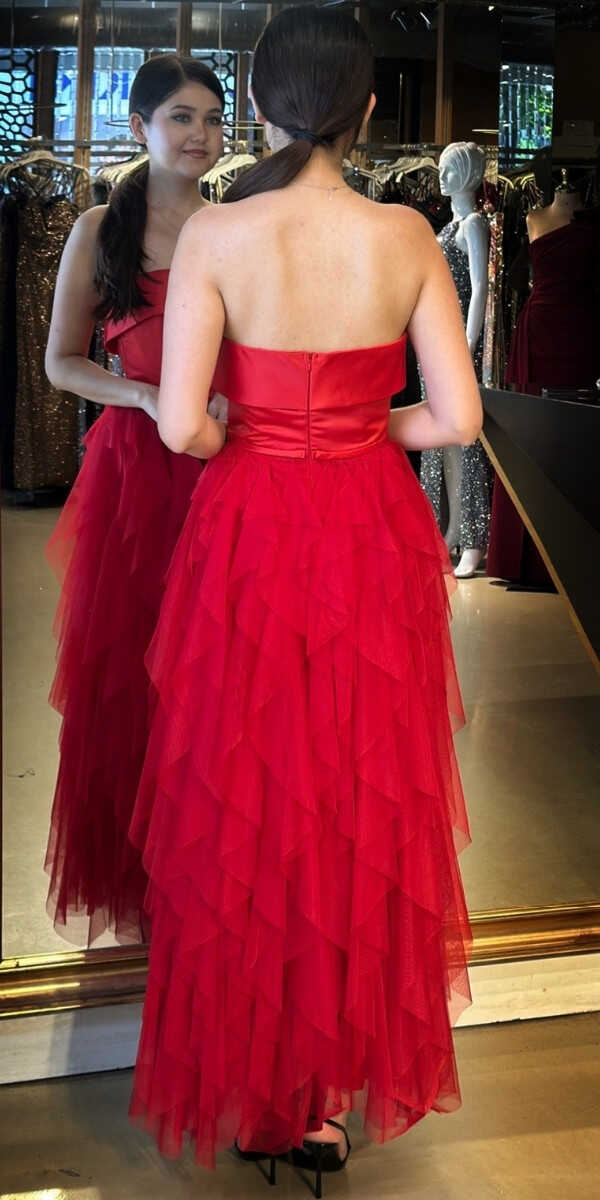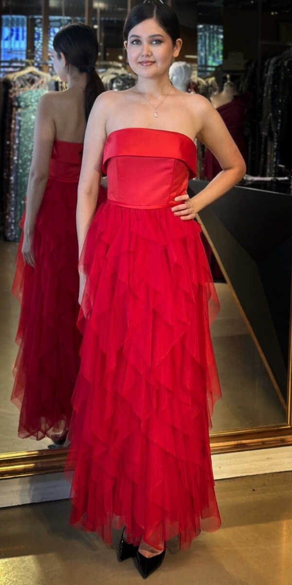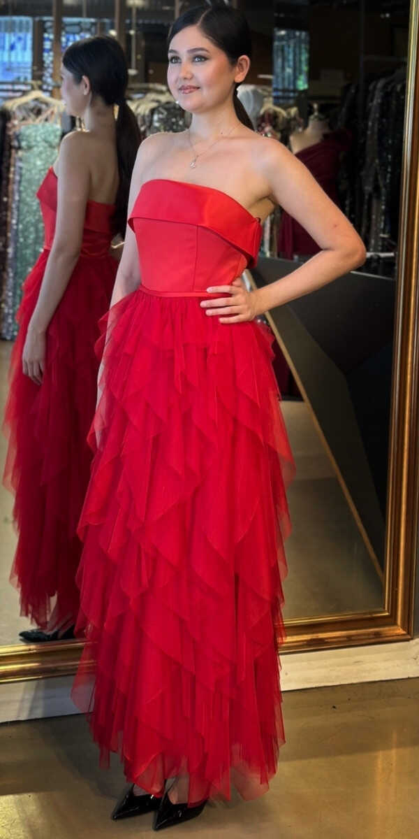 Kırmızı Renk Kloş Etekli Uzun Abiye Elbise, Tül Kumaştan Üretilmiş olup Hafif Olmasından Kaynaklı Sizi Gece Boyu Rahat Hissettirecek.