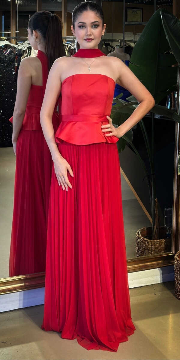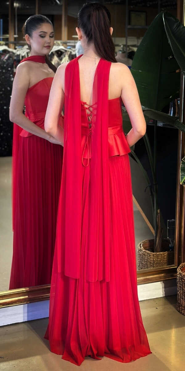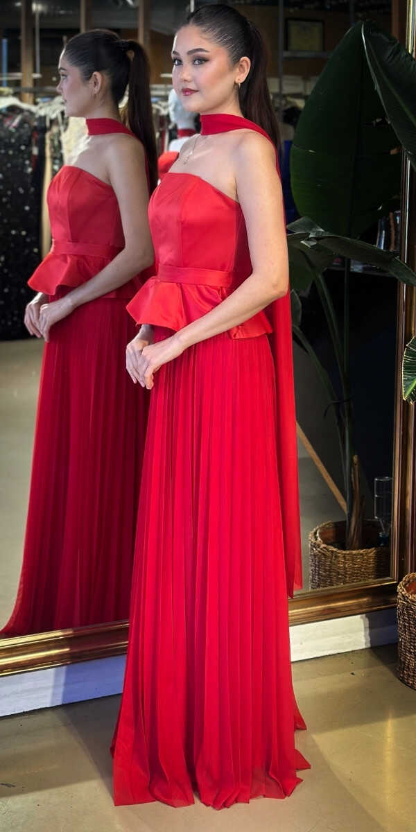 Straplez Yaka Kırmızı Renk Kloş Etekli Uzun Abiye Elbise, Şifon Kumaştan Üretilmiş olup Uçuş Uçuş Şifon Kumaş Tüm Dikkatleri Üzerinize Toplayacaktır. Şık Sırt Dekoltesi Size Çok Yakışacak.