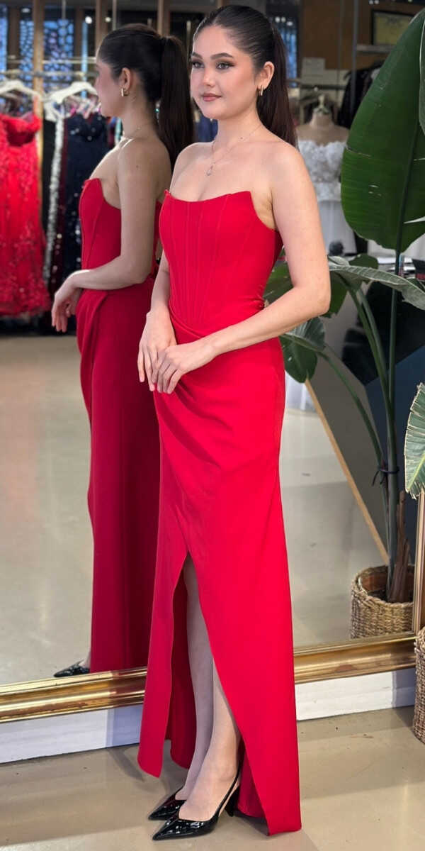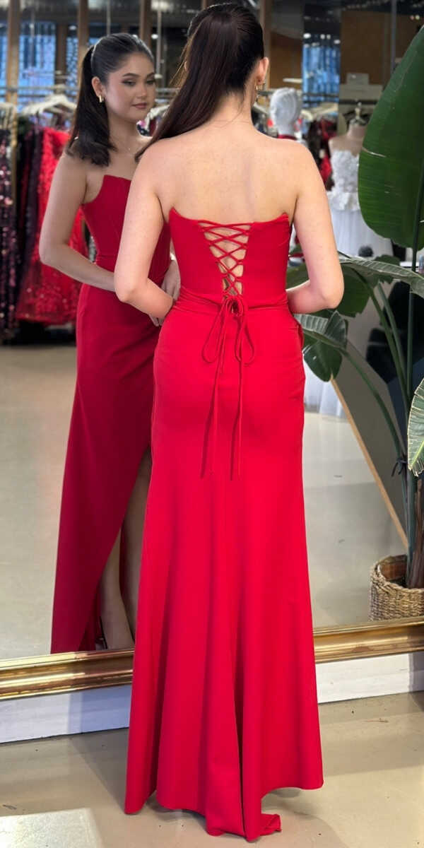 Gelince Haber VerStraplez Yaka Kırmızı Renk Düz Kesim Uzun Abiye Elbise, Krep Kumaştan Üretilmiş olup Hafif Ve Daha Az Kırışan Krep Kumaş Sizi Daha Rahat Hissettirecektir. Şık Sırt Dekoltesi Size Çok Yakışacak. Yırtmaç Detayı Cesur ve Çarpıcı Bir Stil Sunacaktır.