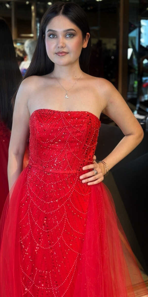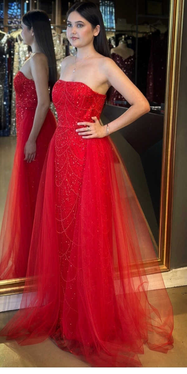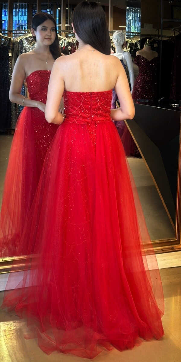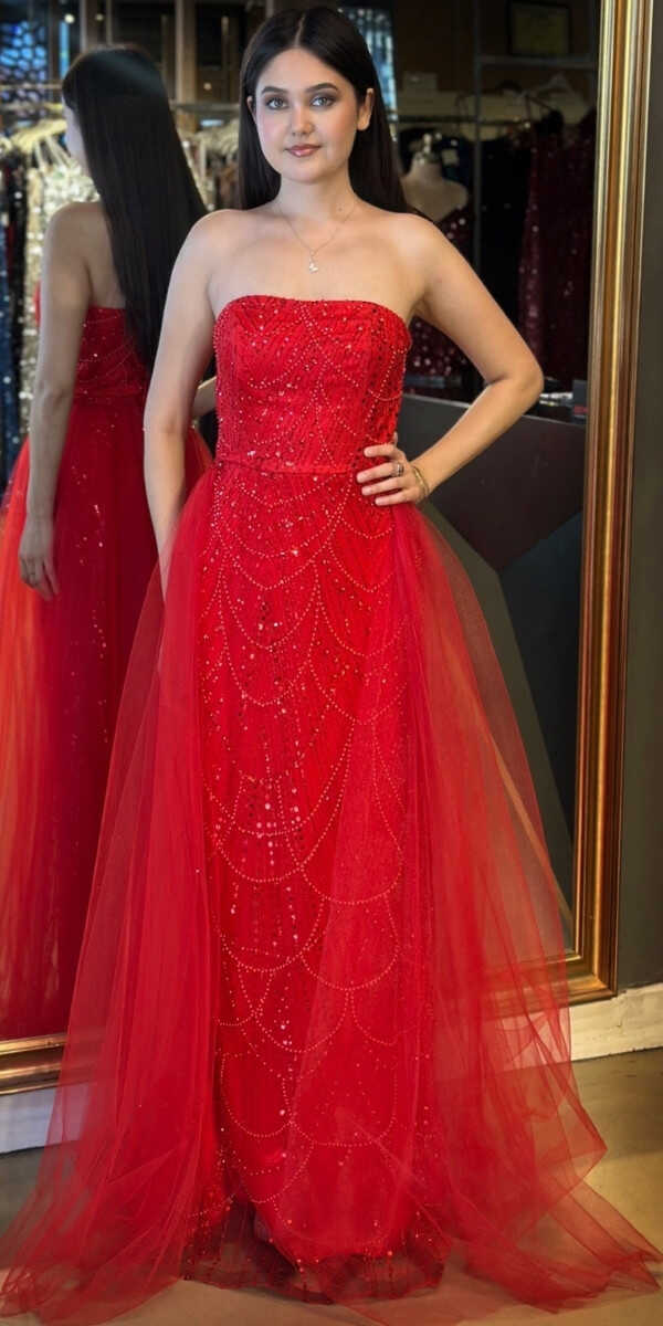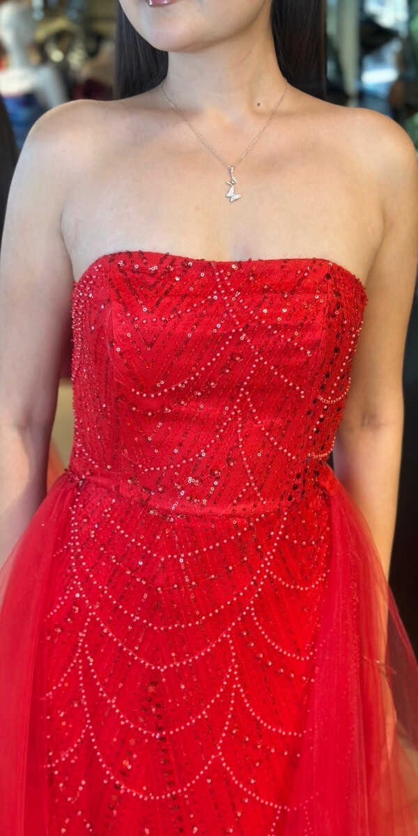 Kırmızı Renk Tül Pelerin Etekli Uzun Abiye Elbise, Pullu Boncuklu Kumaştan Üretilmiş olup Parıltı ve Zarafetin Buluştuğu Kumaş Türü Sizi Işıl Işıl Gösterecektir.