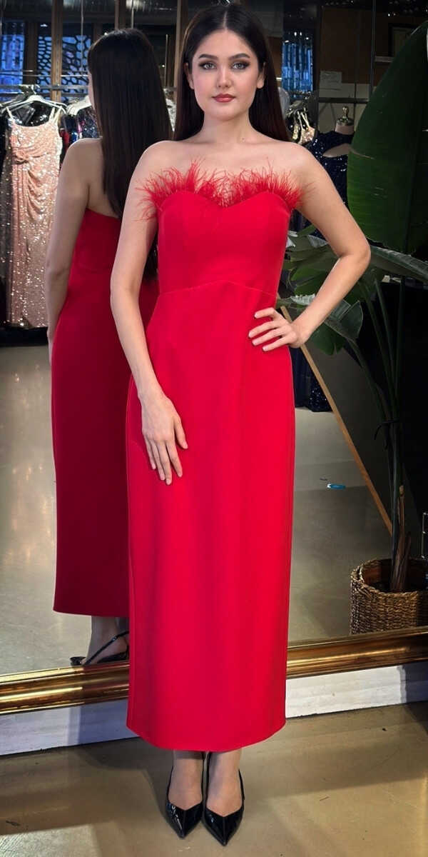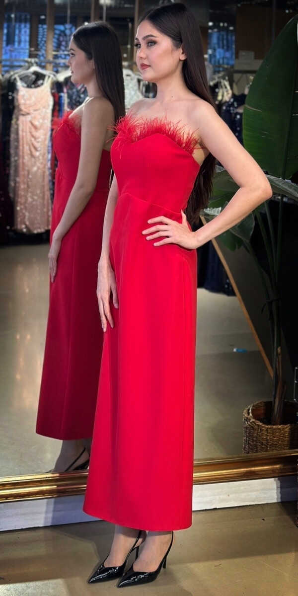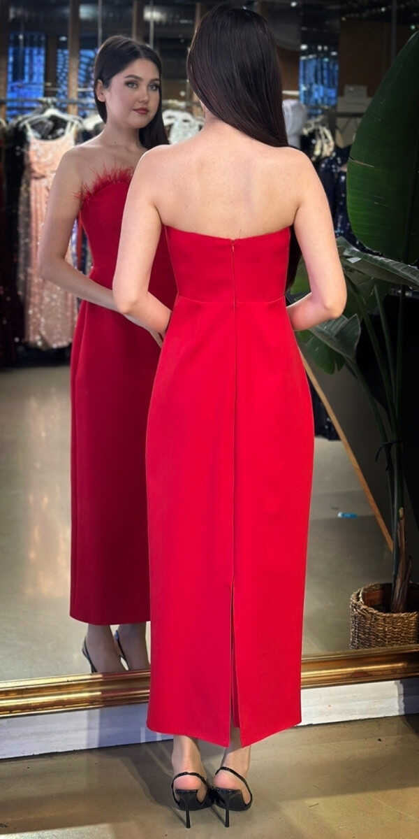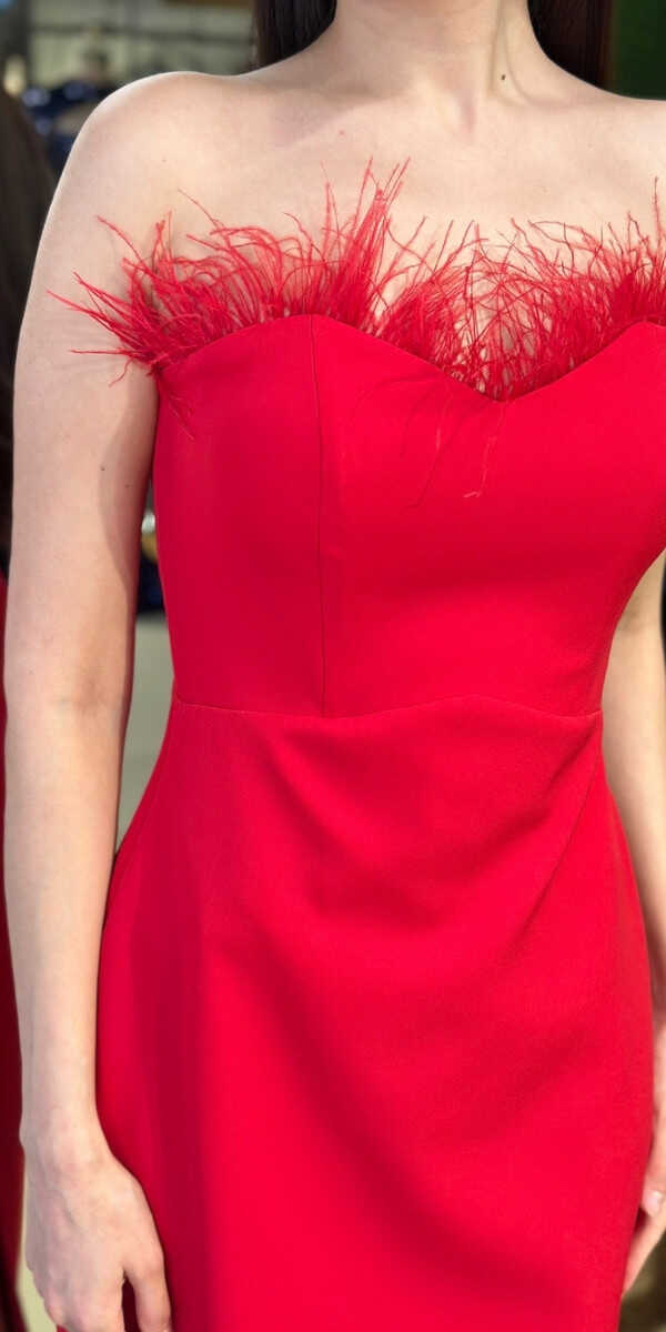 Gelince Haber VerStraplez Yaka Kırmızı Renk Düz Kesim Midi Abiye Elbise, Krep Kumaştan Üretilmiş olup Hafif Ve Daha Az Kırışan Krep Kumaş Sizi Daha Rahat Hissettirecektir. Vücuda uyum sağlayan likralı kumaş, dinamik bir duruş kazandırır. Uçuşan Tüy Detay Sizi Oldukça Havalı Gösterecek. Yırtmaç Detayı Cesur ve Çarpıcı Bir Stil Sunacaktır.