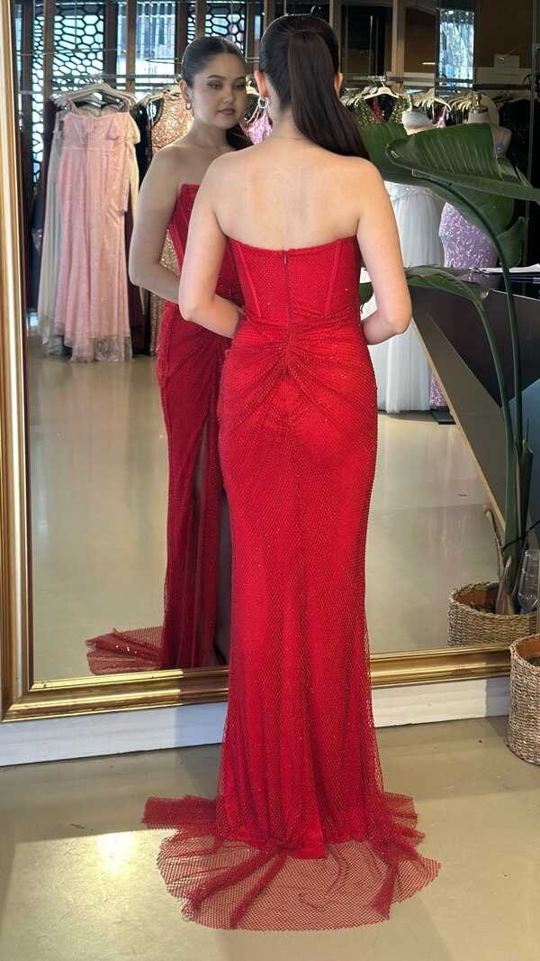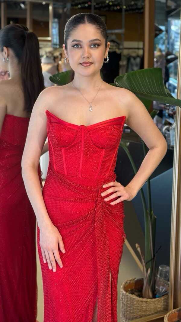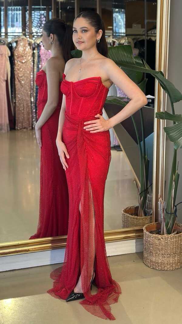 Straplez Yaka Kırmızı Renk Balık Etekli Uzun Abiye Elbise, Taşlı Kumaştan Üretilmiş olup Parıltısıyla Gözlerinizi Kamaştıracaktır Yırtmaç Detayı Cesur ve Çarpıcı Bir Stil Sunacaktır.
