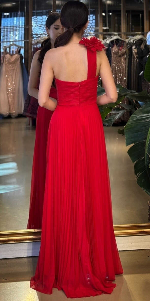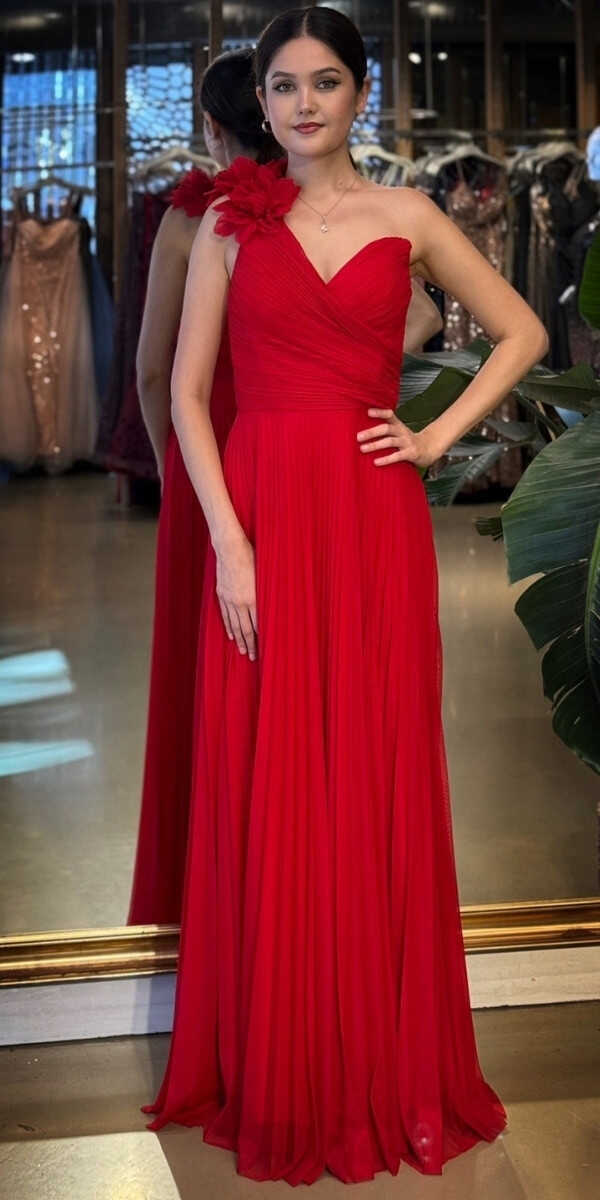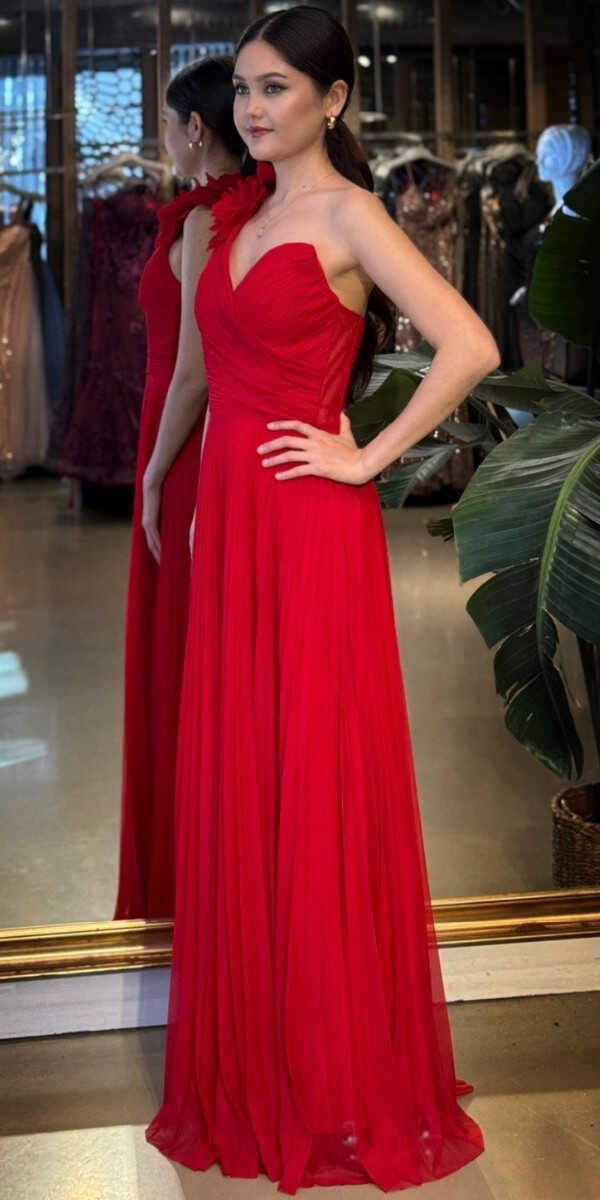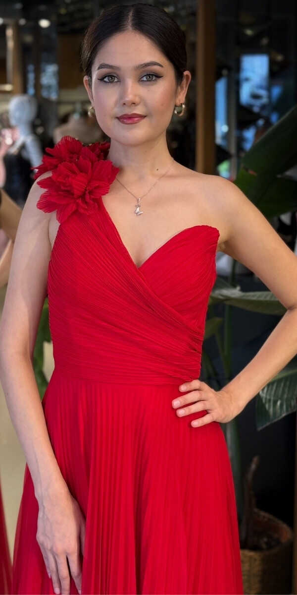 Kırmızı Renk Kloş Etekli Uzun Abiye Elbise, Şifon Tül Kumaştan Üretilmiş olup Şifon tül kumaşıyla uçuş uçuş bir görünüm sağlar. Tek omuz detayıyla modern bir ifade oluşturur.