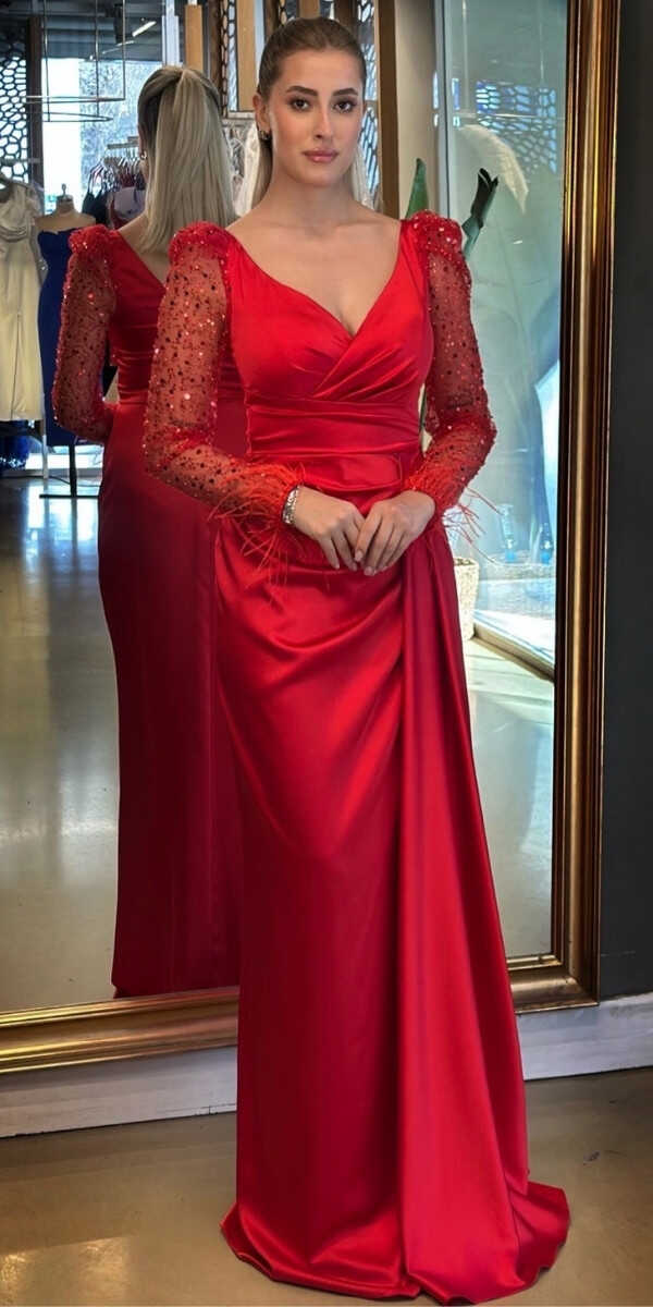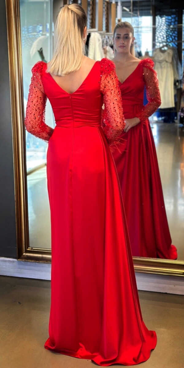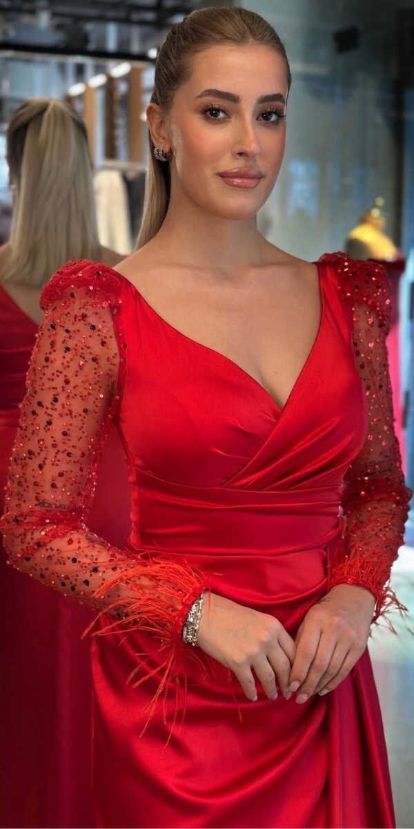 Kırmızı Renk Düz Kesim Uzun Abiye Elbise, Saten Kumaştan Üretilmiş Olup Satenin Pürüzsüz Işığı Görünümünüze Zarafet Katacaktır. Uçuşan Tüy Detay Sizi Oldukça Havalı Gösterecek. Yırtmaç Detayı Cesur ve Çarpıcı Bir Stil Sunacaktır.